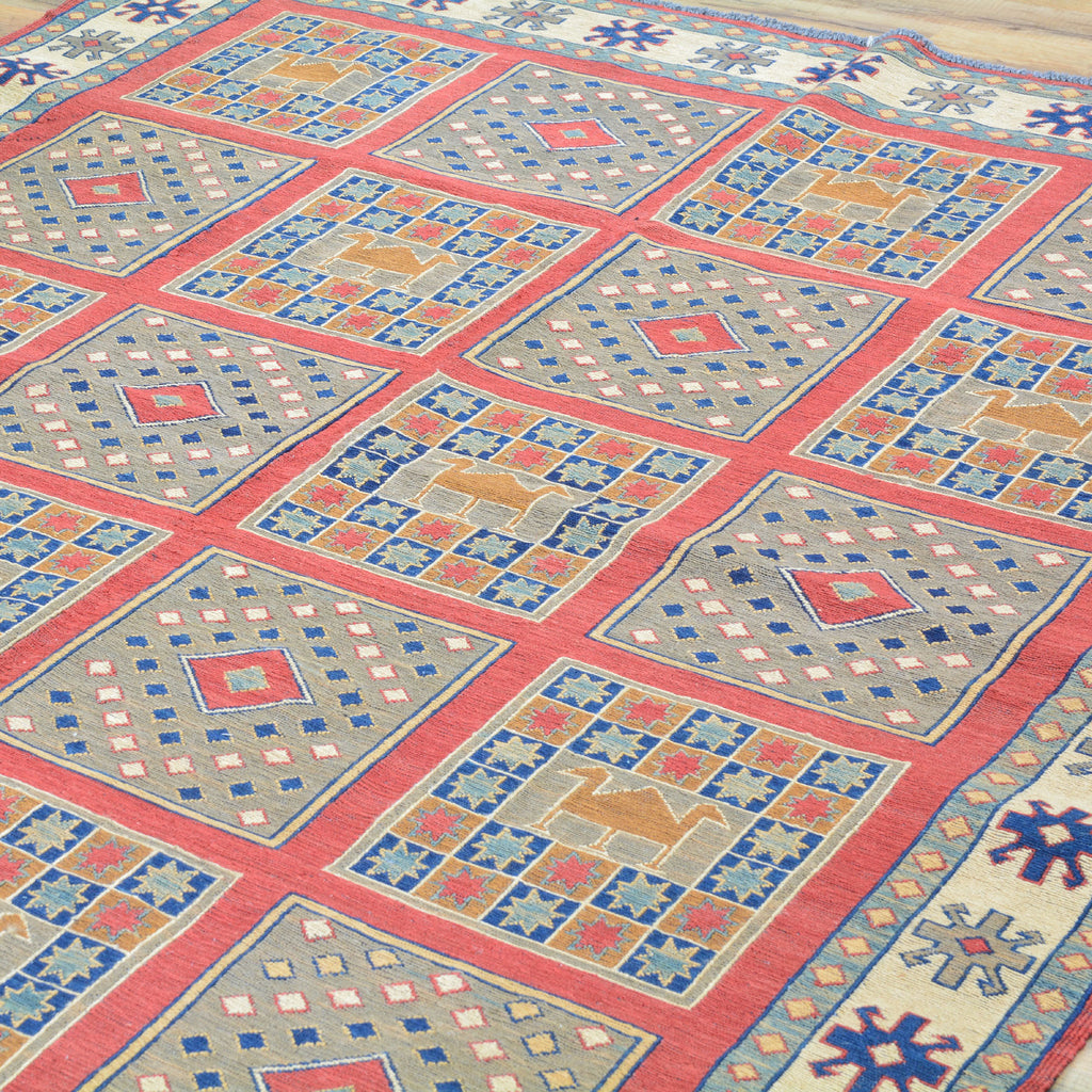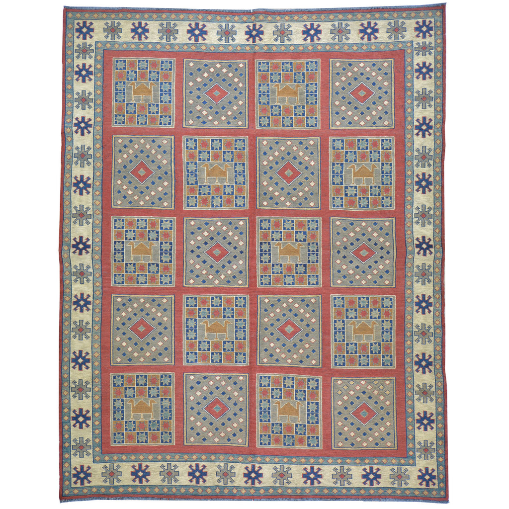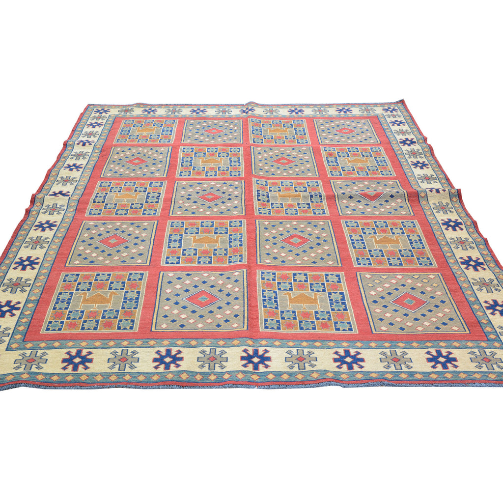 The Soumak Technique is an interesting method of weaving and can result in very beautiful and durable rugs. This method is not as methodical as hand knotted rugs, but it is somewhat more complex than a simple weave. In a traditional weave, the thread is passed alternately in front of and behind the warp. The Soumak weave adds a loop around alternating weaves resulting in an even stronger "stitch." An added layer of complexity includes the loop on the alternate warp in the following row. The end result gives the rug a braided appearance that gives the artist opportunity to incorporate complex geometries into the overall design. This is one of the flat weave techniques that produces a two-sided rug suitable for wall hanging and as a floor rug.