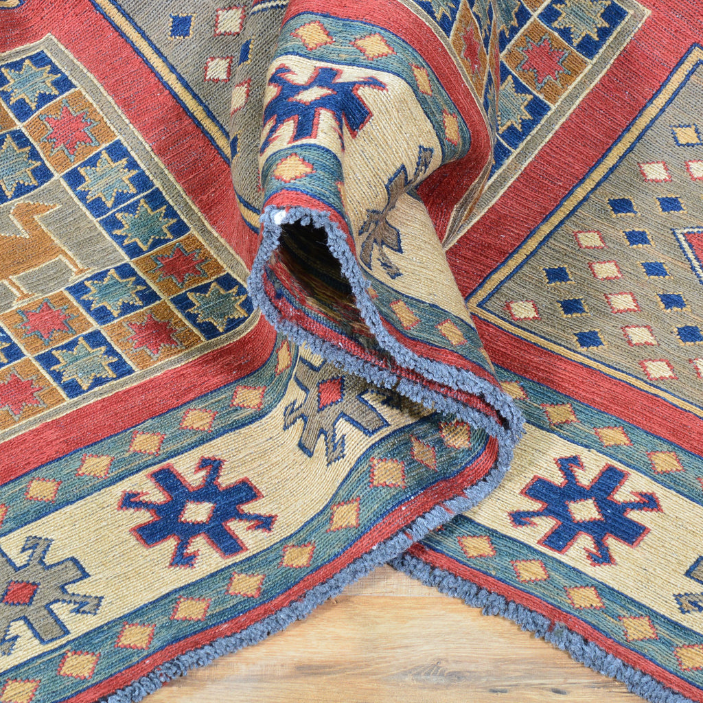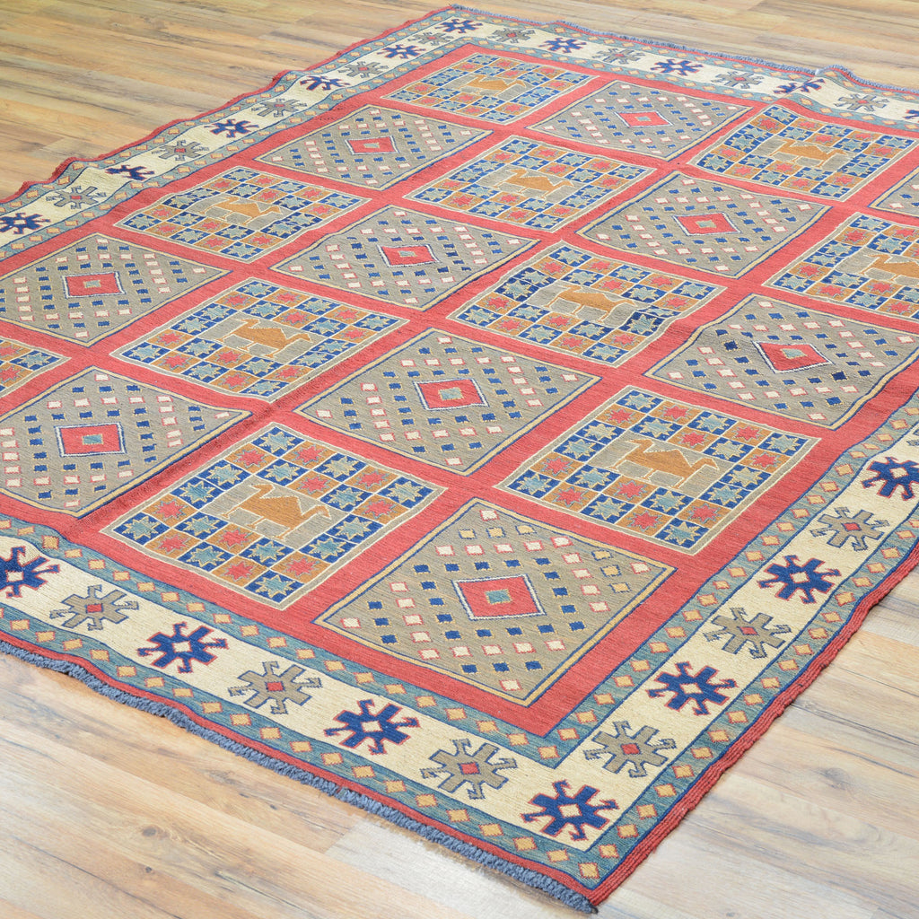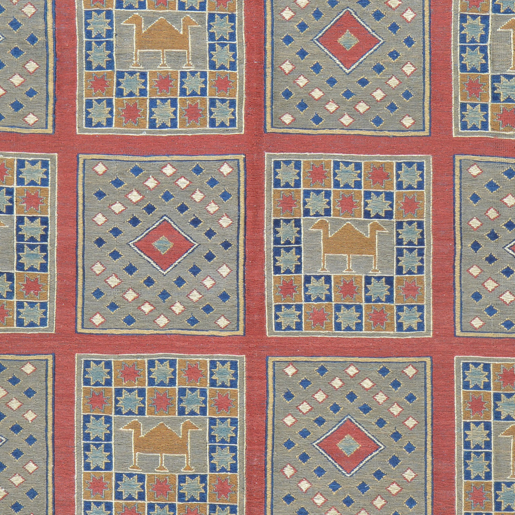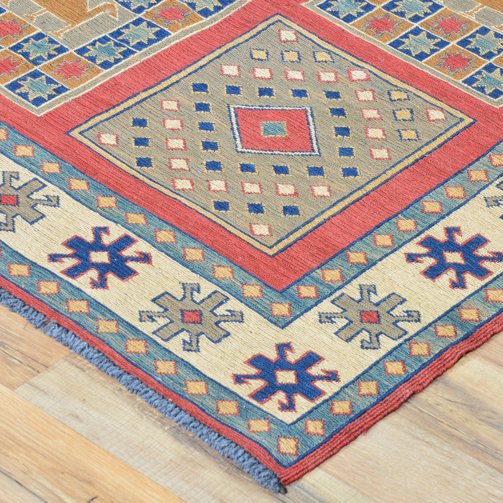 The Soumak Technique is an interesting method of weaving and can result in very beautiful and durable rugs. This method is not as methodical as hand knotted rugs, but it is somewhat more complex than a simple weave. In a traditional weave, the thread is passed alternately in front of and behind the warp. The Soumak weave adds a loop around alternating weaves resulting in an even stronger "stitch." An added layer of complexity includes the loop on the alternate warp in the following row. The end result gives the rug a braided appearance that gives the artist opportunity to incorporate complex geometries into the overall design. This is one of the flat weave techniques that produces a two-sided rug suitable for wall hanging and as a floor rug.
