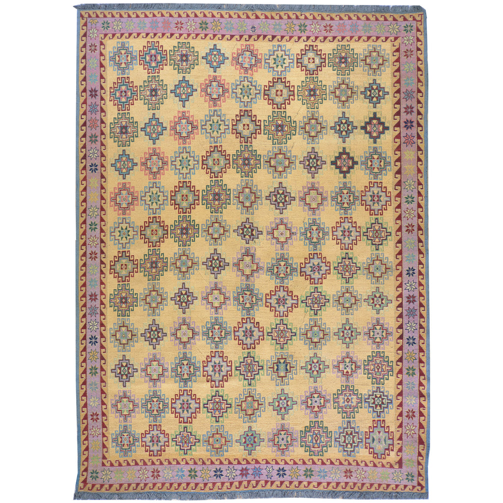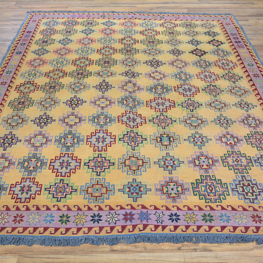 The Soumak Technique is an interesting method of weaving and can result in very beautiful and durable rugs. This method is not as methodical as hand knotted rugs, but it is somewhat more complex than a simple weave. In a traditional weave, the thread is passed alternately in front of and behind the warp. The Soumak weave adds a loop around alternating weaves resulting in an even stronger "stitch." An added layer of complexity includes the loop on the alternate warp in the following row. The end result gives the rug a braided appearance that gives the artist opportunity to incorporate complex geometries into the overall design. This is one of the flat weave techniques that produces a two-sided rug suitable for wall hanging and as a floor rug.