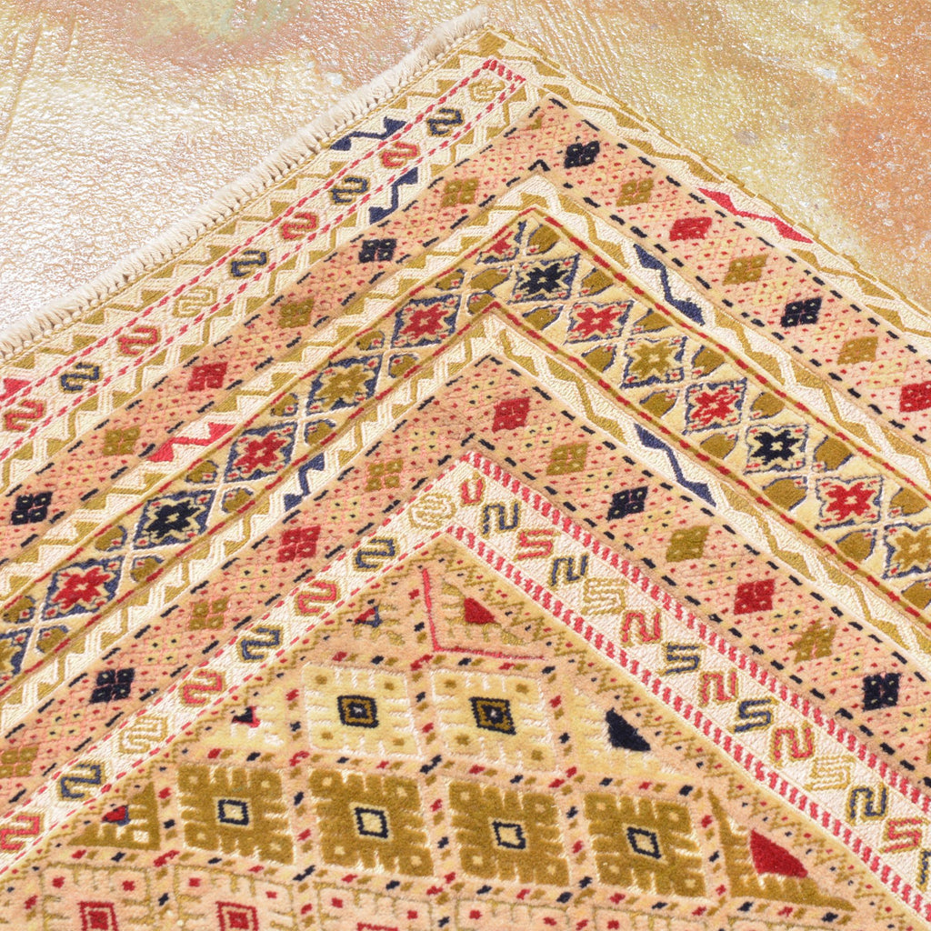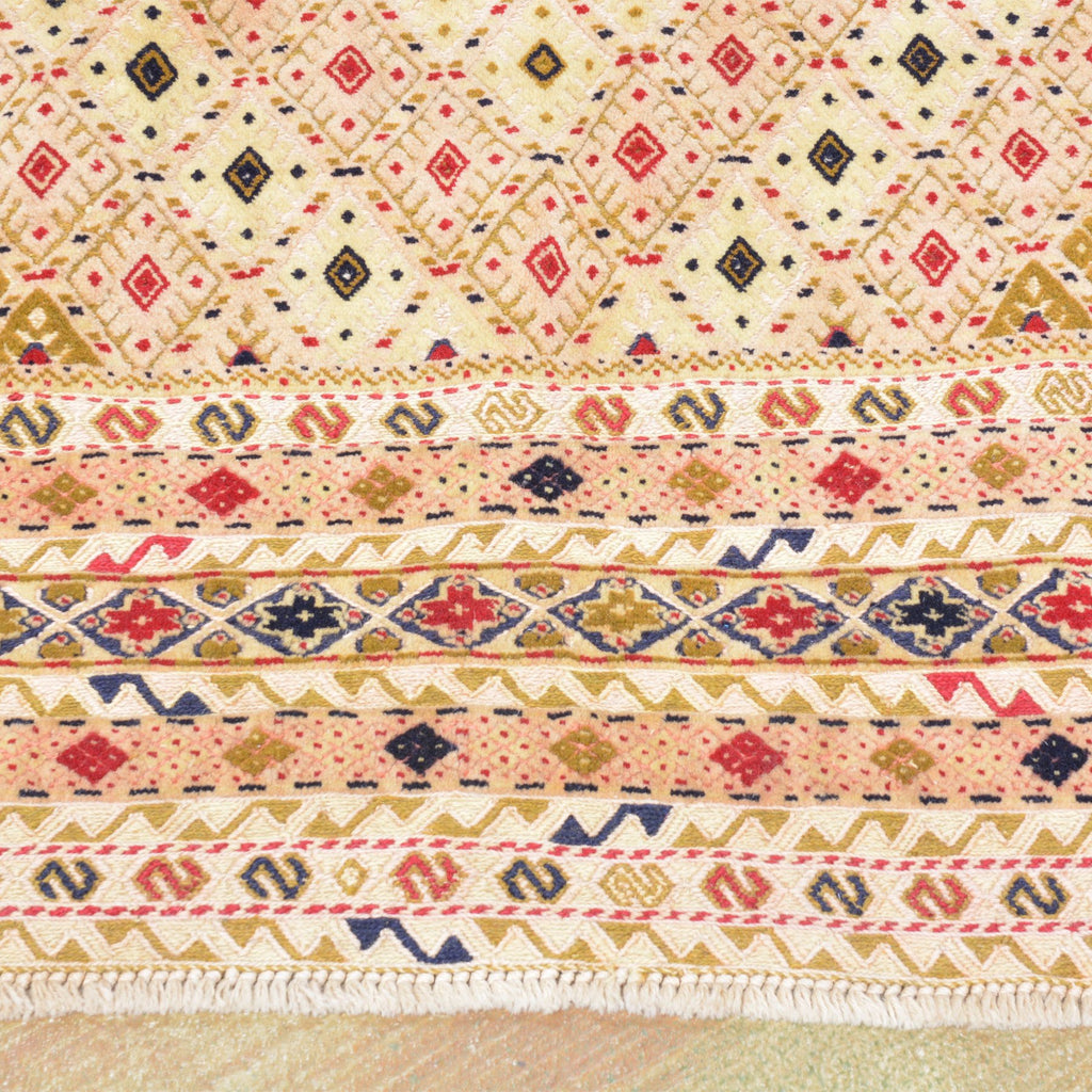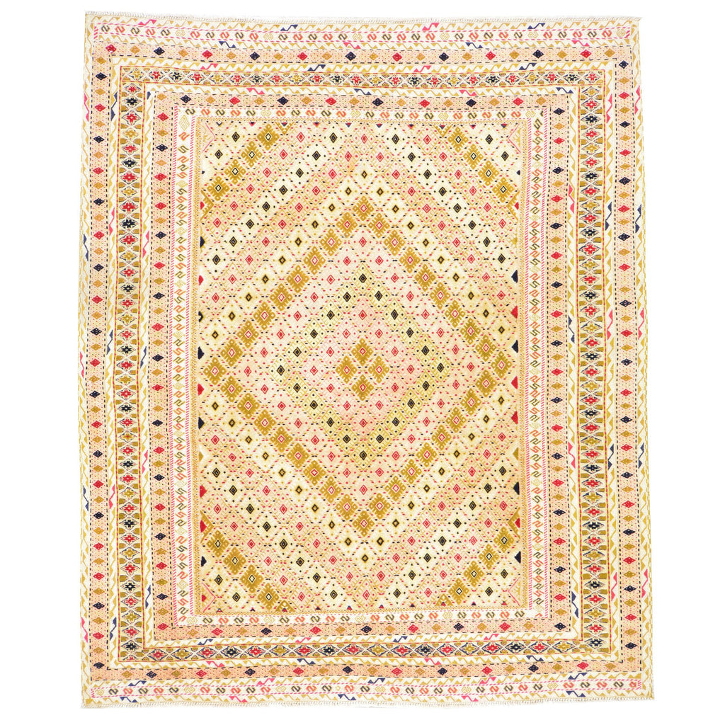 This technique combines both types of weaving, Hand-Knotted and the Soumak technique. This type of weaving uses the Soumak weave to highlight areas of a piled Hand-Knotted rug, creating a unique sturdy texture.