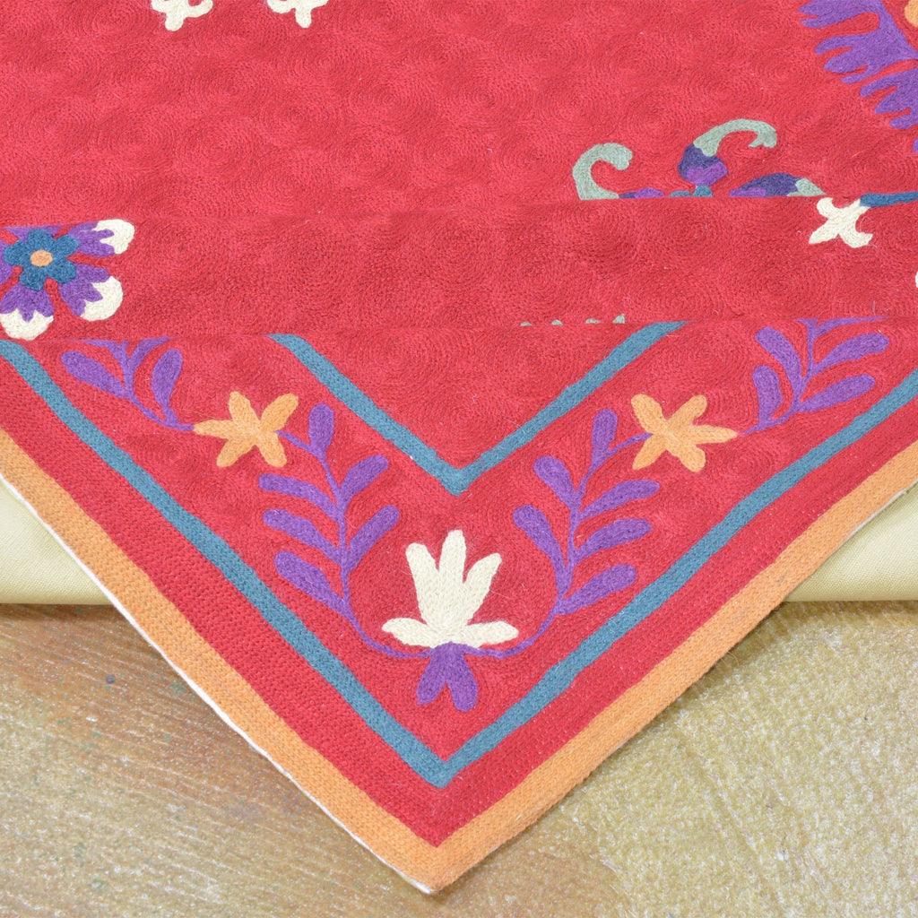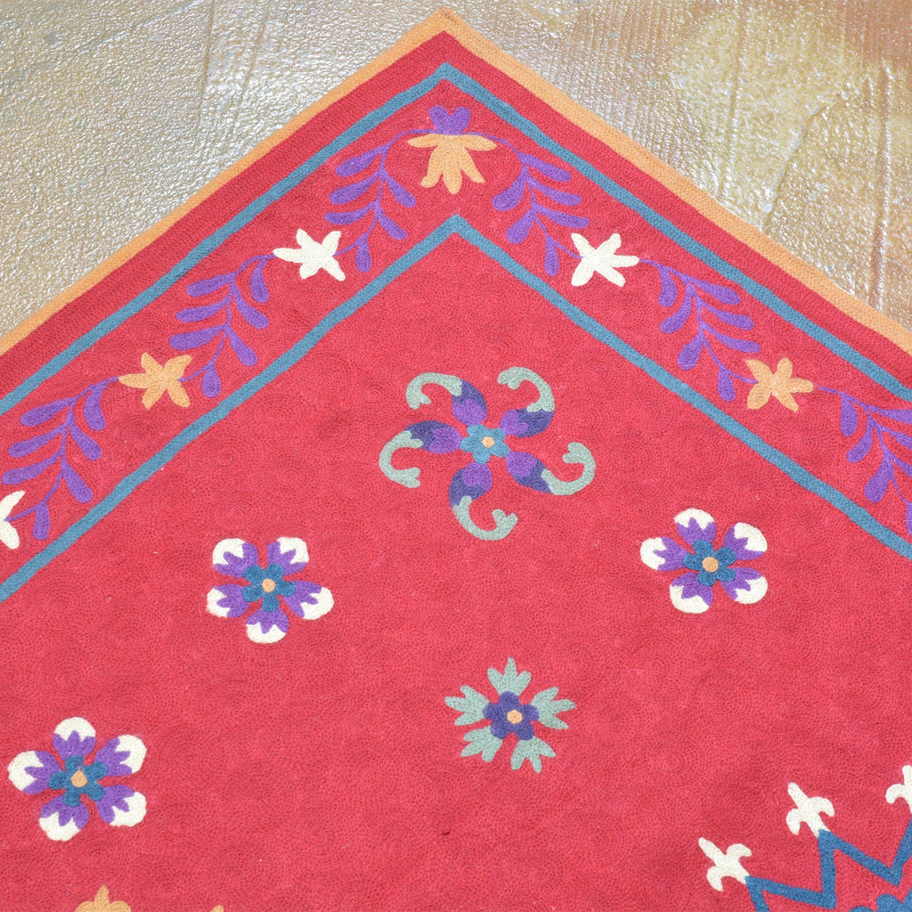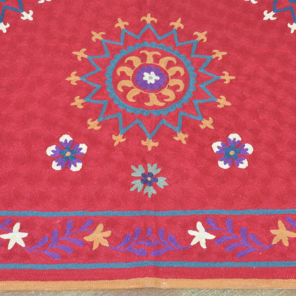 Chain stitching is an embroidery technique that is stitched into a finished woven fabric. The ability to incorporate designs one stitch at a time rather than through a weaving process can create strikingly beautiful patterns. This stitch also allows the artist to utilize any color they choose at any point across the background. This freedom to add point-by-point color results in fascinating, multi-faceted designs that can truly range anywhere from formal to festive.