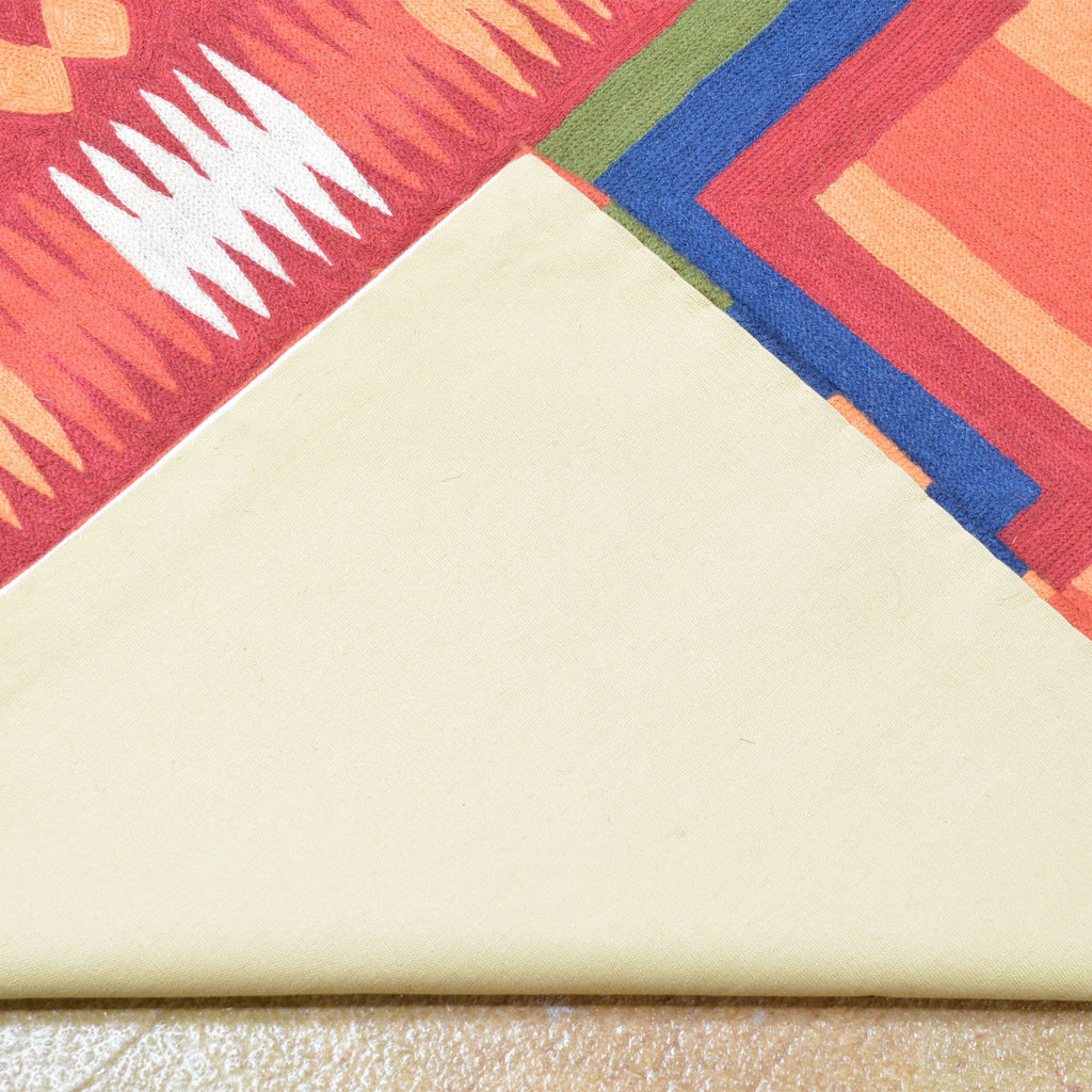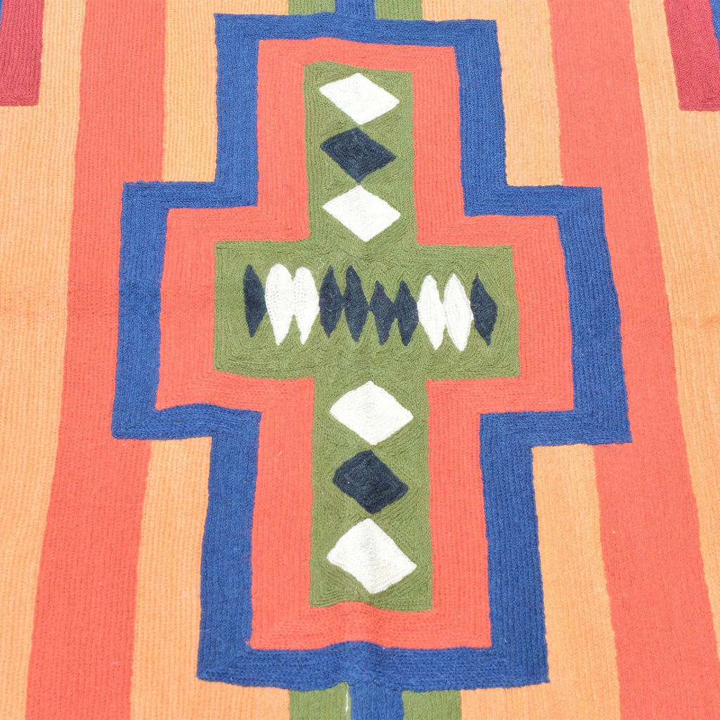 Chain stitching is an embroidery technique that is stitched into a finished woven fabric. The ability to incorporate designs one stitch at a time rather than through a weaving process can create strikingly beautiful patterns. This stitch also allows the artist to utilize any color they choose at any point across the background. This freedom to add point-by-point color results in fascinating, multi-faceted designs that can truly range anywhere from formal to festive.