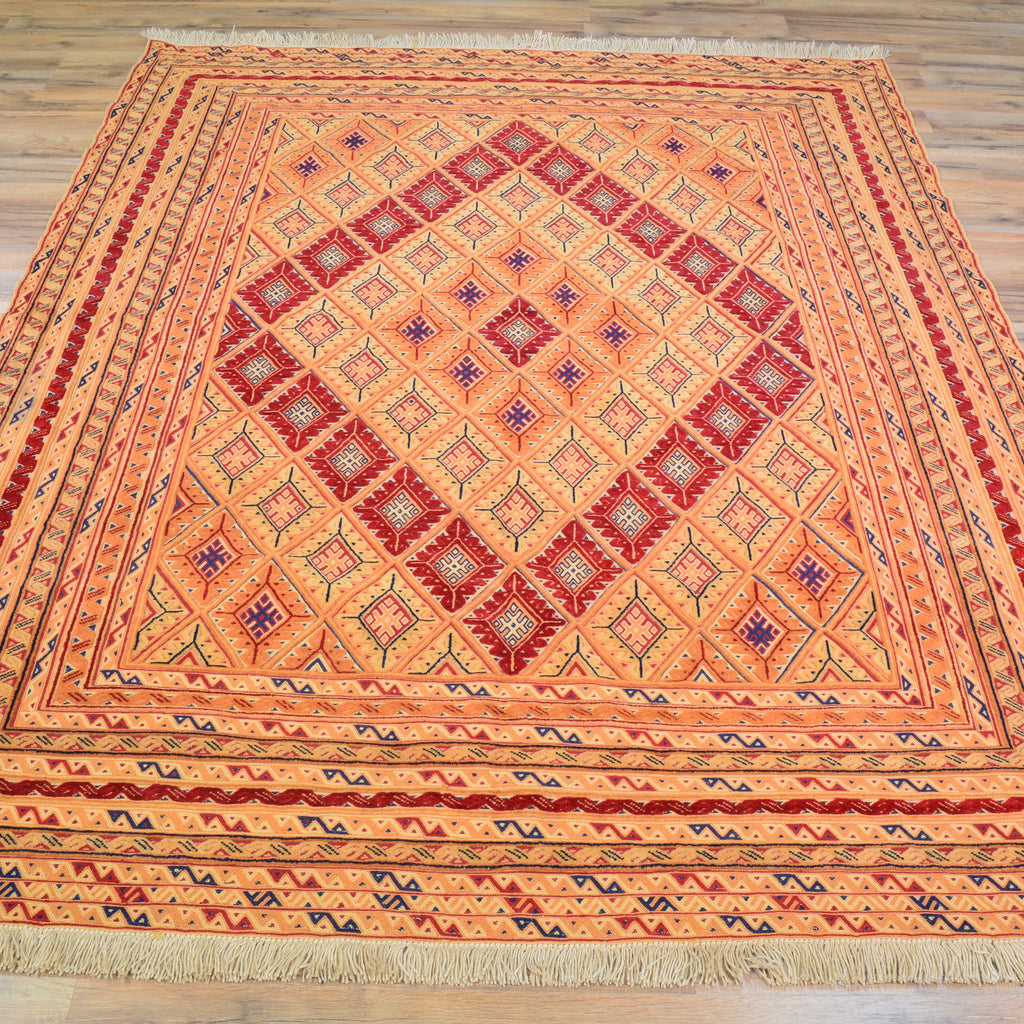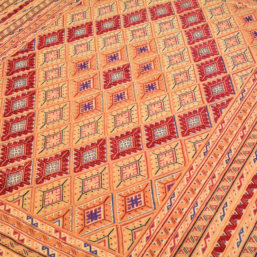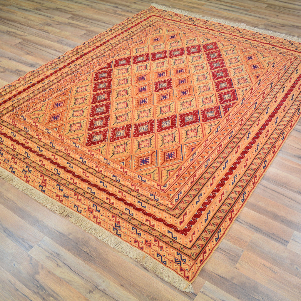 This technique combines both types of weaving, Hand-Knotted and the Soumak technique. This type of weaving uses the Soumak weave to highlight areas of a piled Hand-Knotted rug, creating a unique sturdy texture.
