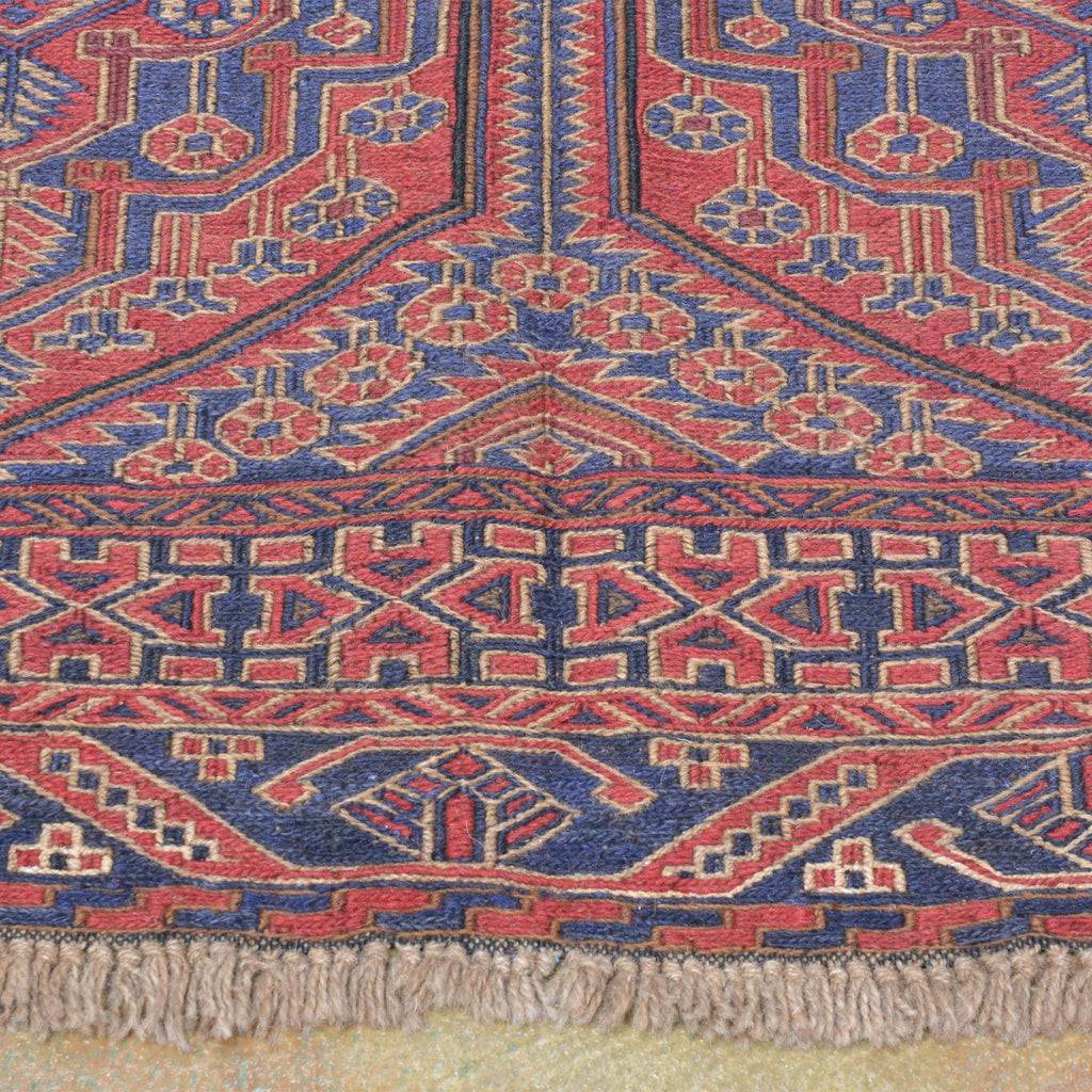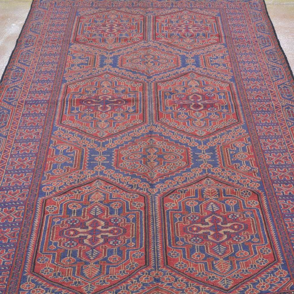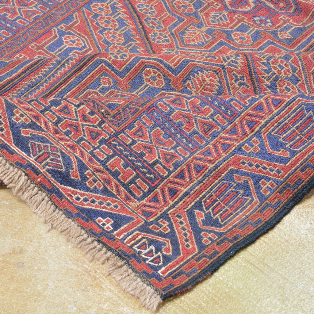 The Soumak Technique is an interesting method of weaving and can result in very beautiful and durable rugs. This method is not as methodical as hand knotted rugs, but it is somewhat more complex than a simple weave. In a traditional weave, the thread is passed alternately in front of and behind the warp. The Soumak weave adds a loop around alternating weaves resulting in an even stronger "stitch." An added layer of complexity includes the loop on the alternate warp in the following row. The end result gives the rug a braided appearance that gives the artist opportunity to incorporate complex geometries into the overall design. This is one of the flat weave techniques that produces a two-sided rug suitable for wall hanging and as a floor rug.