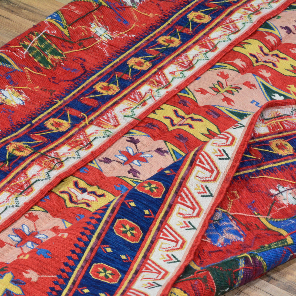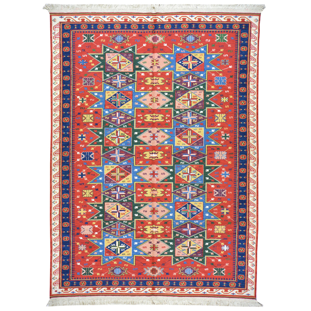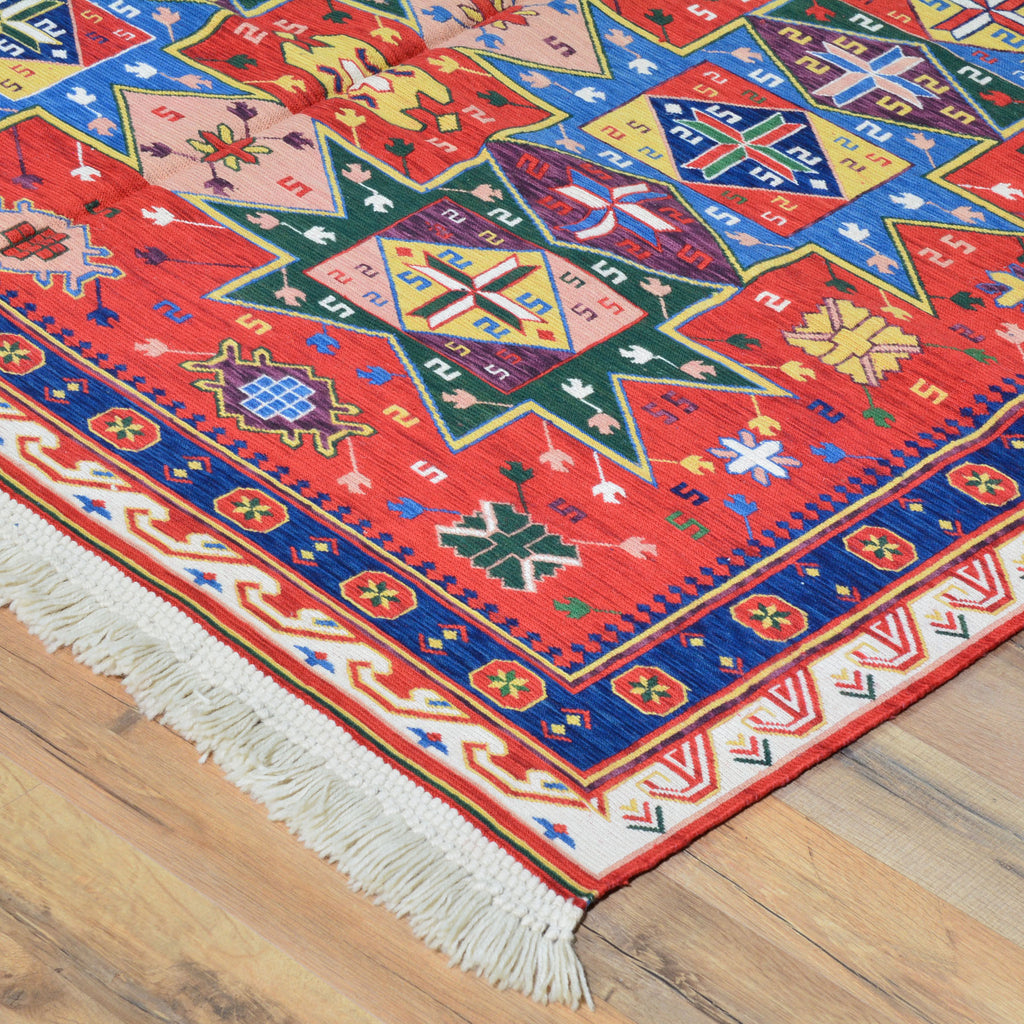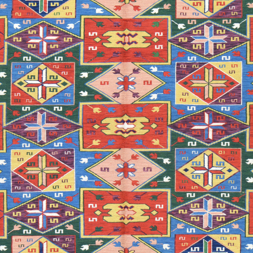 The Soumak Technique is an interesting method of weaving and can result in very beautiful and durable rugs. This method is not as methodical as hand knotted rugs, but it is somewhat more complex than a simple weave. In a traditional weave, the thread is passed alternately in front of and behind the warp. The Soumak weave adds a loop around alternating weaves resulting in an even stronger "stitch." An added layer of complexity includes the loop on the alternate warp in the following row. The end result gives the rug a braided appearance that gives the artist opportunity to incorporate complex geometries into the overall design. This is one of the flat weave techniques that produces a two-sided rug suitable for wall hanging and as a floor rug.