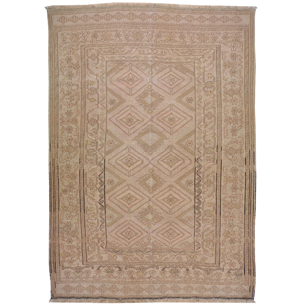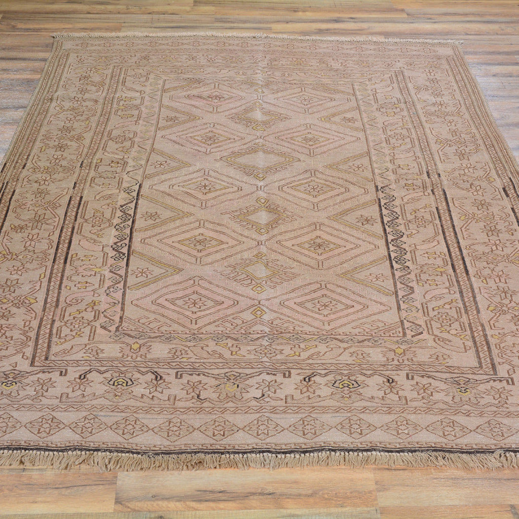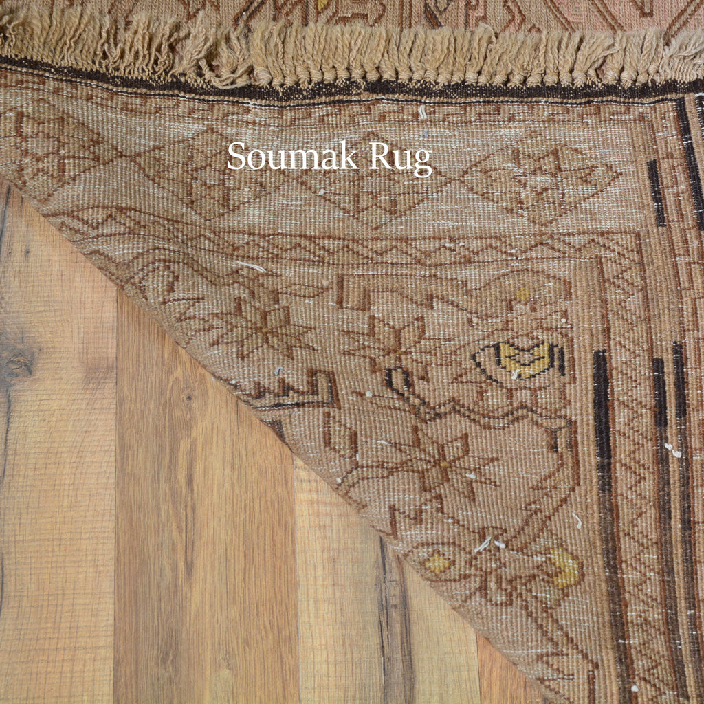 The Soumak Technique is an interesting method of weaving and can result in very beautiful and durable rugs. This method is not as methodical as hand knotted rugs, but it is somewhat more complex than a simple weave. In a traditional weave, the thread is passed alternately in front of and behind the warp. The Soumak weave adds a loop around alternating weaves resulting in an even stronger "stitch." An added layer of complexity includes the loop on the alternate warp in the following row. The end result gives the rug a braided appearance that gives the artist opportunity to incorporate complex geometries into the overall design. This is one of the flat weave techniques that produces a two-sided rug suitable for wall hanging and as a floor rug.