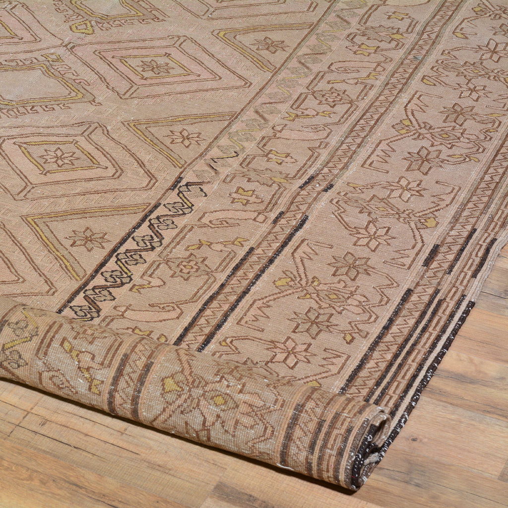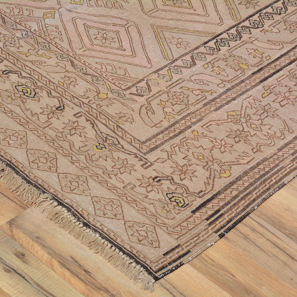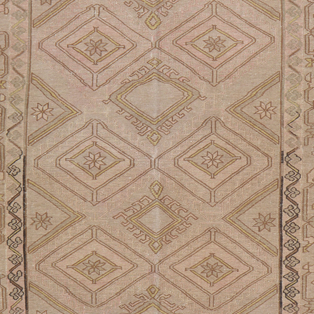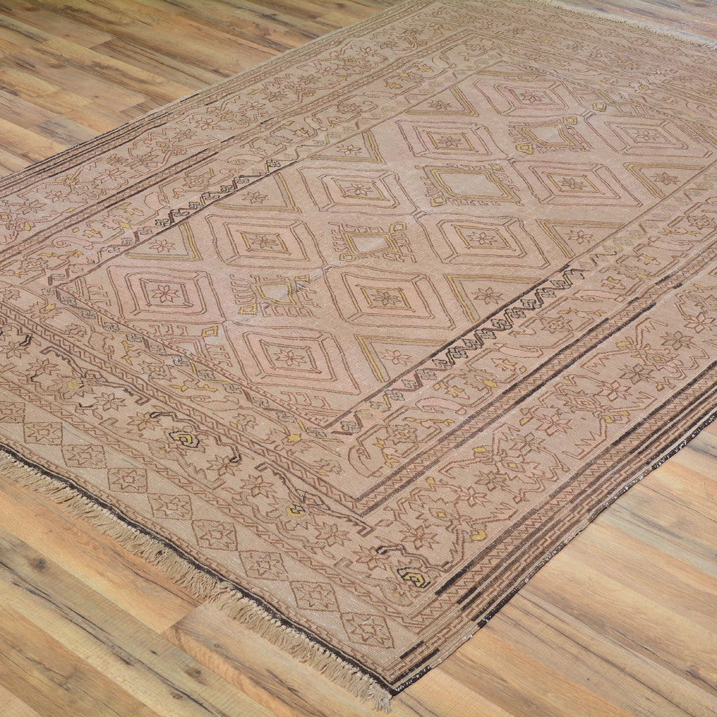 The Soumak Technique is an interesting method of weaving and can result in very beautiful and durable rugs. This method is not as methodical as hand knotted rugs, but it is somewhat more complex than a simple weave. In a traditional weave, the thread is passed alternately in front of and behind the warp. The Soumak weave adds a loop around alternating weaves resulting in an even stronger "stitch." An added layer of complexity includes the loop on the alternate warp in the following row. The end result gives the rug a braided appearance that gives the artist opportunity to incorporate complex geometries into the overall design. This is one of the flat weave techniques that produces a two-sided rug suitable for wall hanging and as a floor rug.