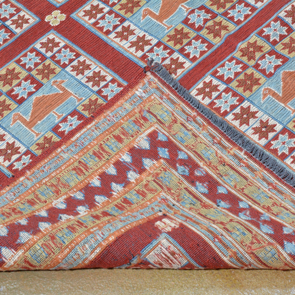 The Soumak Technique is an interesting method of weaving and can result in very beautiful and durable rugs. This method is not as methodical as hand knotted rugs, but it is somewhat more complex than a simple weave. In a traditional weave, the thread is passed alternately in front of and behind the warp. The Soumak weave adds a loop around alternating weaves resulting in an even stronger "stitch." An added layer of complexity includes the loop on the alternate warp in the following row. The end result gives the rug a braided appearance that gives the artist opportunity to incorporate complex geometries into the overall design. This is one of the flat weave techniques that produces a two-sided rug suitable for wall hanging and as a floor rug.