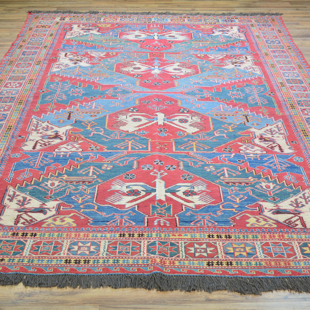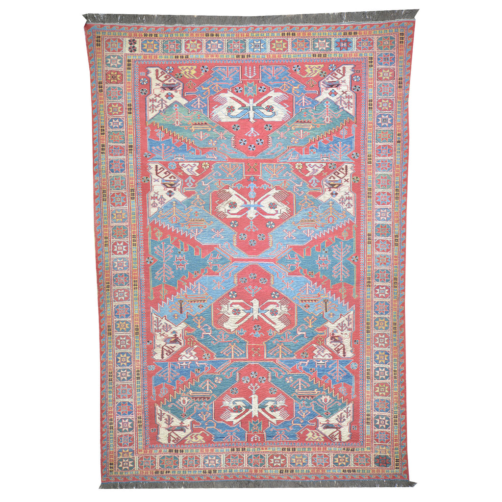 The Soumak Technique is an interesting method of weaving and can result in very beautiful and durable rugs. This method is not as methodical as hand knotted rugs, but it is somewhat more complex than a simple weave. In a traditional weave, the thread is passed alternately in front of and behind the warp. The Soumak weave adds a loop around alternating weaves resulting in an even stronger "stitch." An added layer of complexity includes the loop on the alternate warp in the following row. The end result gives the rug a braided appearance that gives the artist opportunity to incorporate complex geometries into the overall design. This is one of the flat weave techniques that produces a two-sided rug suitable for wall hanging and as a floor rug.