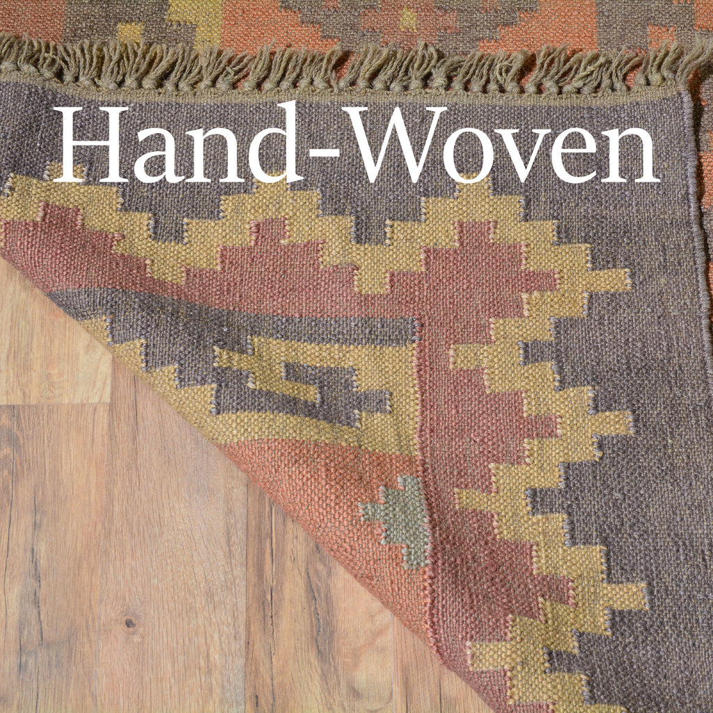 A Hand-Woven rug can also be called a Kilim, or Flatweave and it uses what is called a "Slit-weave" technique. The Slit-weave technique uses only a warp yarn as the foundation, allowing the weaver to build the rug by interlacing the yarn, as the weft.
