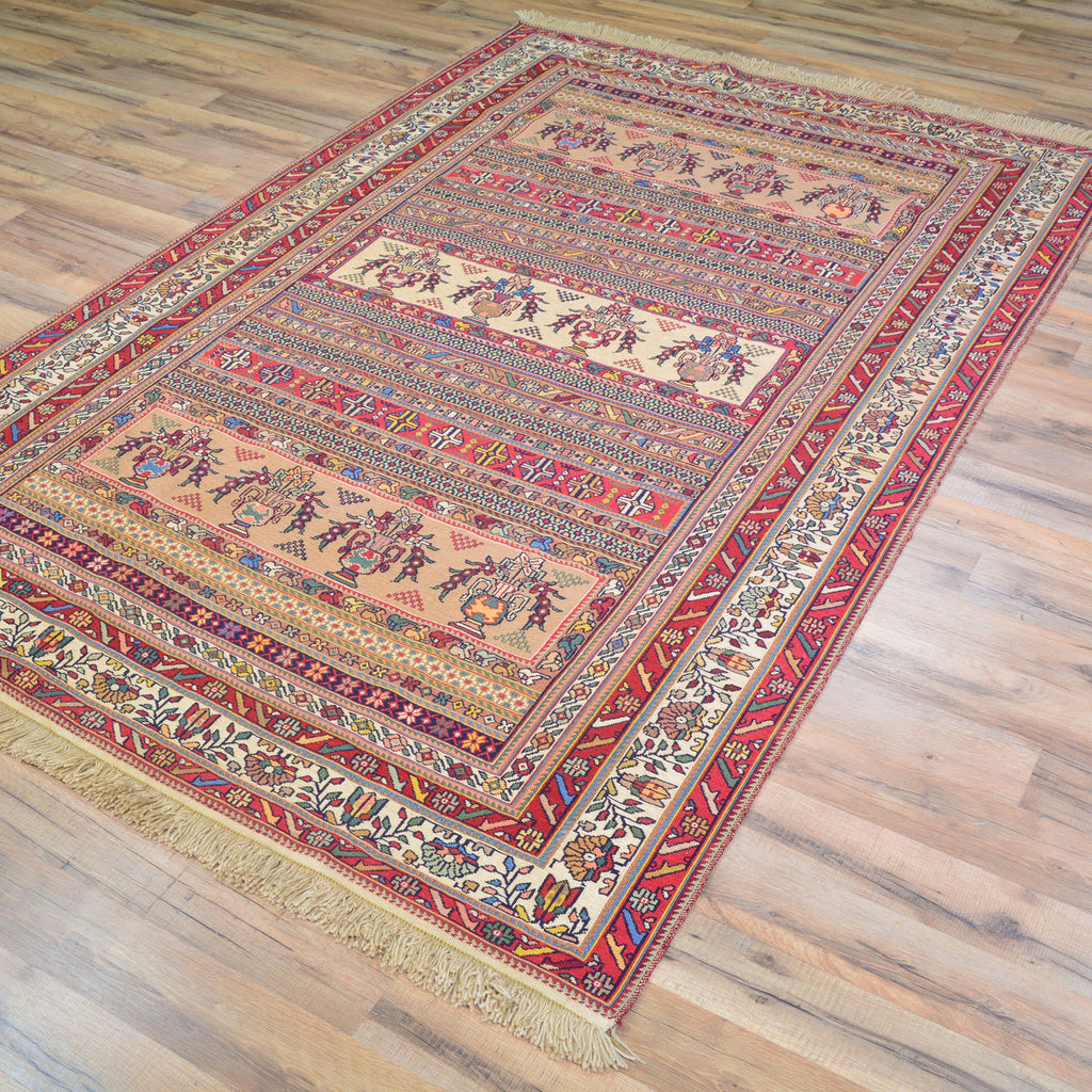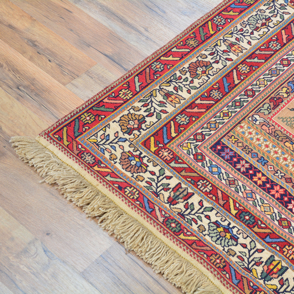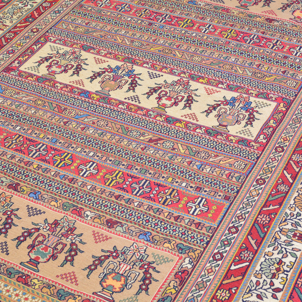 The Soumak Technique is an interesting method of weaving and can result in very beautiful and durable rugs. This method is not as methodical as hand knotted rugs, but it is somewhat more complex than a simple weave. In a traditional weave, the thread is passed alternately in front of and behind the warp. The Soumak weave adds a loop around alternating weaves resulting in an even stronger "stitch." An added layer of complexity includes the loop on the alternate warp in the following row. The end result gives the rug a braided appearance that gives the artist opportunity to incorporate complex geometries into the overall design. This is one of the flat weave techniques that produces a two-sided rug suitable for wall hanging and as a floor rug.