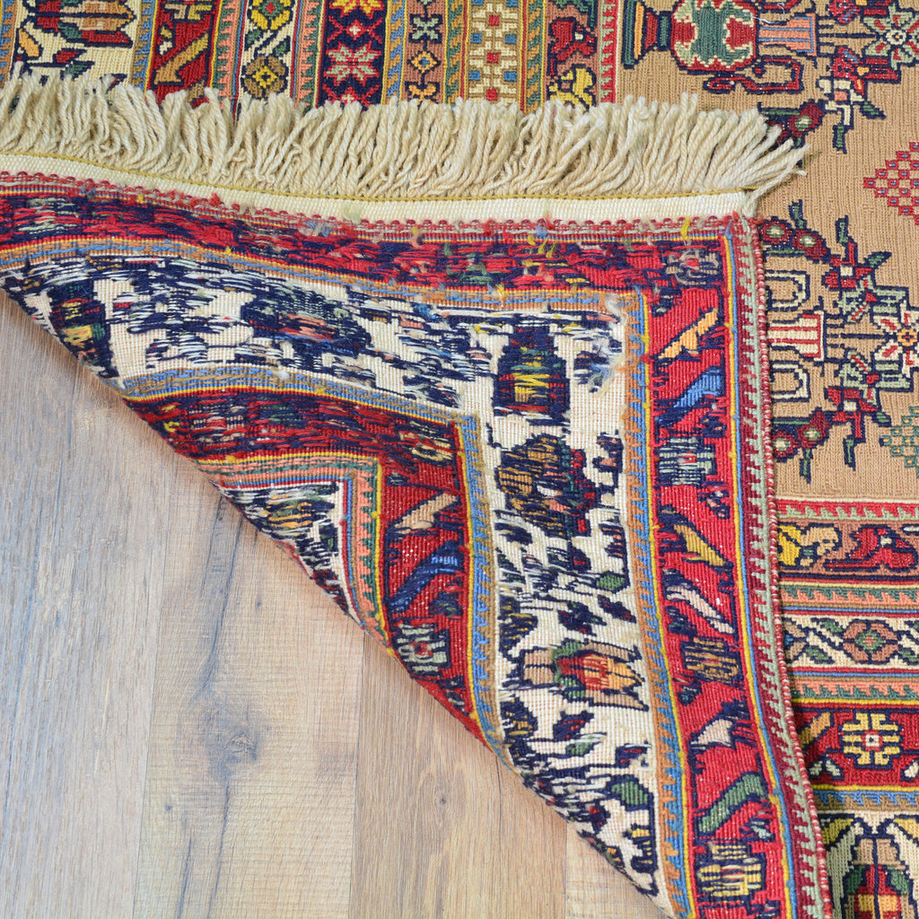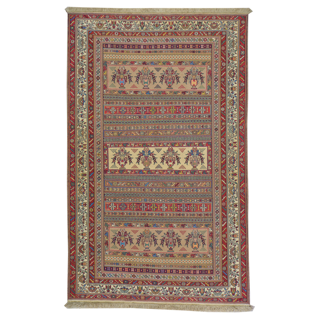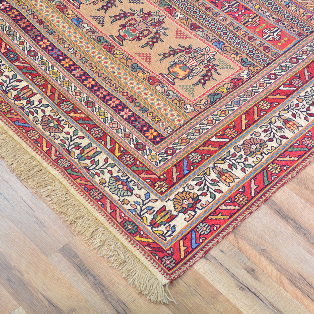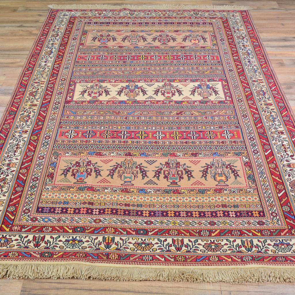 The Soumak Technique is an interesting method of weaving and can result in very beautiful and durable rugs. This method is not as methodical as hand knotted rugs, but it is somewhat more complex than a simple weave. In a traditional weave, the thread is passed alternately in front of and behind the warp. The Soumak weave adds a loop around alternating weaves resulting in an even stronger "stitch." An added layer of complexity includes the loop on the alternate warp in the following row. The end result gives the rug a braided appearance that gives the artist opportunity to incorporate complex geometries into the overall design. This is one of the flat weave techniques that produces a two-sided rug suitable for wall hanging and as a floor rug.