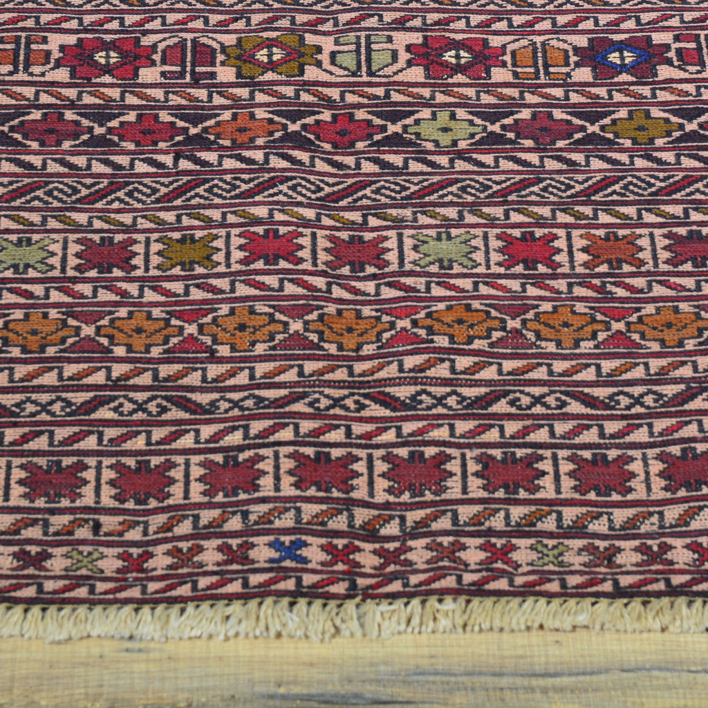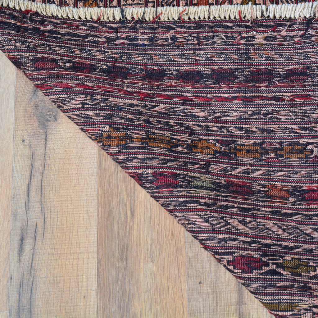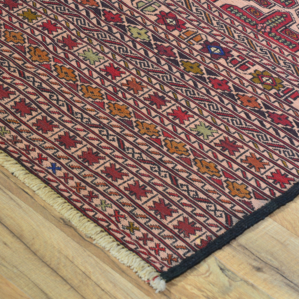 The Soumak Technique is an interesting method of weaving and can result in very beautiful and durable rugs. This method is not as methodical as hand knotted rugs, but it is somewhat more complex than a simple weave. In a traditional weave, the thread is passed alternately in front of and behind the warp. The Soumak weave adds a loop around alternating weaves resulting in an even stronger "stitch." An added layer of complexity includes the loop on the alternate warp in the following row. The end result gives the rug a braided appearance that gives the artist opportunity to incorporate complex geometries into the overall design. This is one of the flat weave techniques that produces a two-sided rug suitable for wall hanging and as a floor rug.