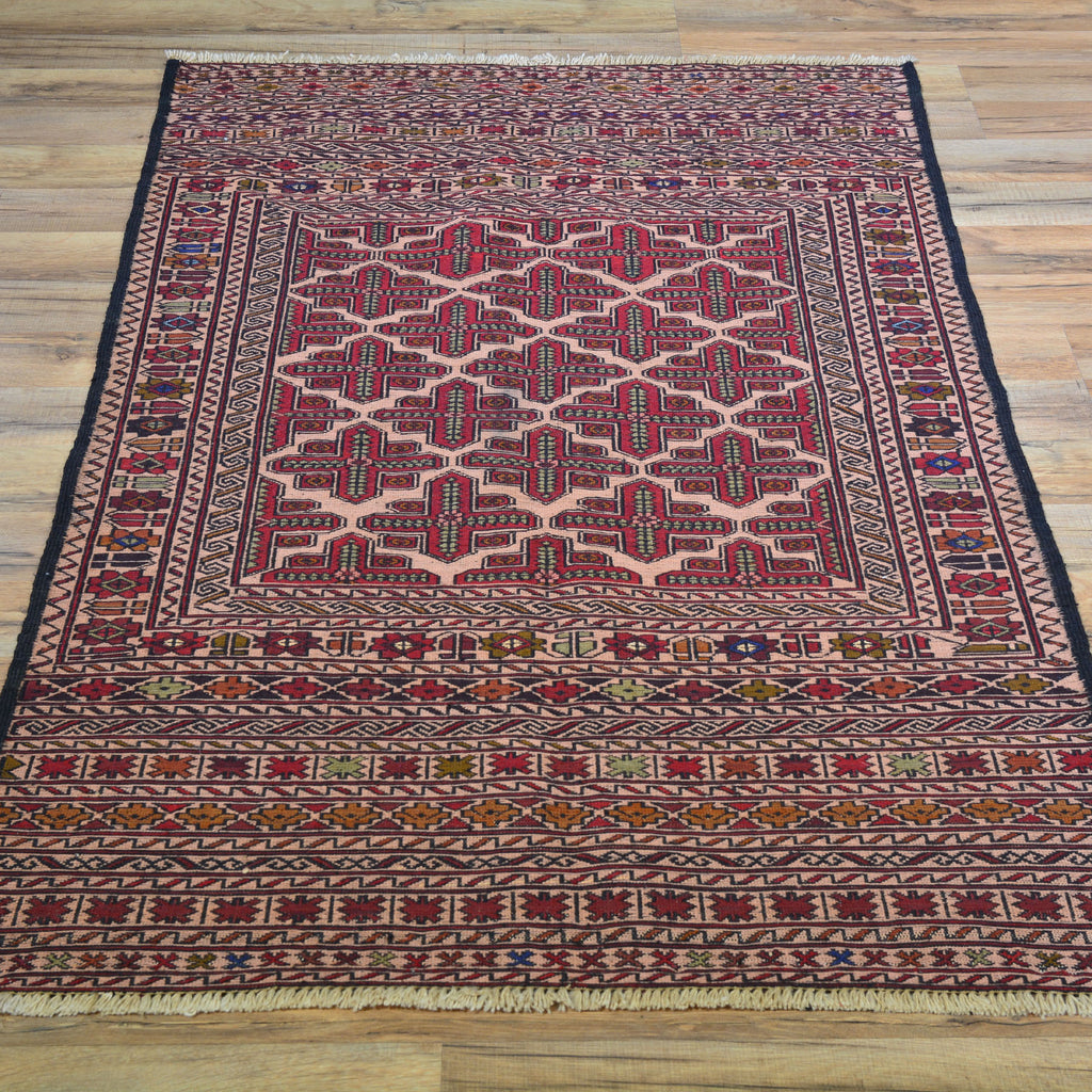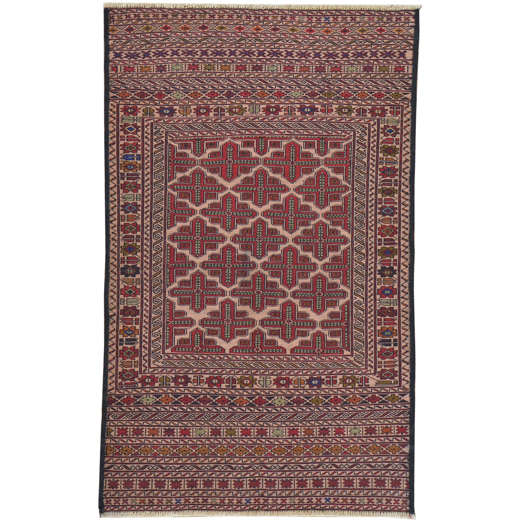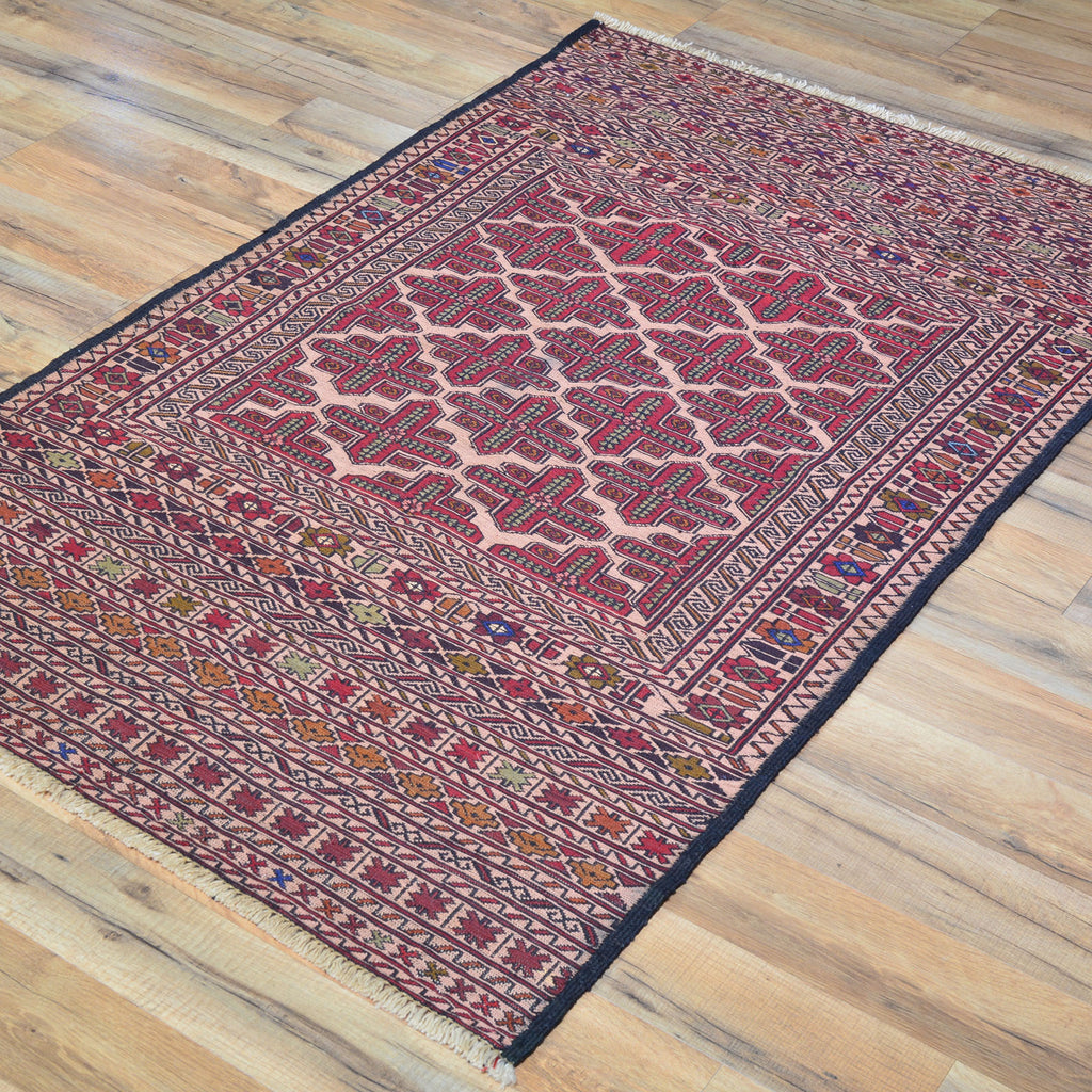 The Soumak Technique is an interesting method of weaving and can result in very beautiful and durable rugs. This method is not as methodical as hand knotted rugs, but it is somewhat more complex than a simple weave. In a traditional weave, the thread is passed alternately in front of and behind the warp. The Soumak weave adds a loop around alternating weaves resulting in an even stronger "stitch." An added layer of complexity includes the loop on the alternate warp in the following row. The end result gives the rug a braided appearance that gives the artist opportunity to incorporate complex geometries into the overall design. This is one of the flat weave techniques that produces a two-sided rug suitable for wall hanging and as a floor rug.