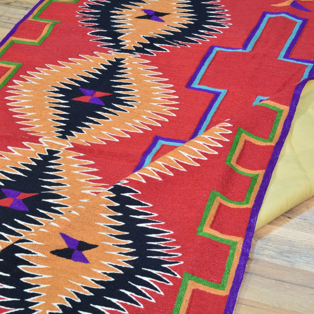Chain stitching is an embroidery technique that is stitched into a finished woven fabric. The ability to incorporate designs one stitch at a time rather than through a weaving process can create strikingly beautiful patterns. This stitch also allows the artist to utilize any color they choose at any point across the background. This freedom to add point-by-point color results in fascinating, multi-faceted designs that can truly range anywhere from formal to festive.