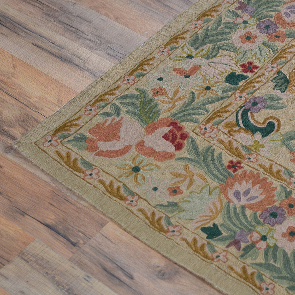 Because the chain stitch is not a weaving technique, curves and other naturally flowing designs are advantages over typical woven rugs. The experience and creative mind of an artisan are the few limitations to the beauty and intrigue of a chain-stitched rug.