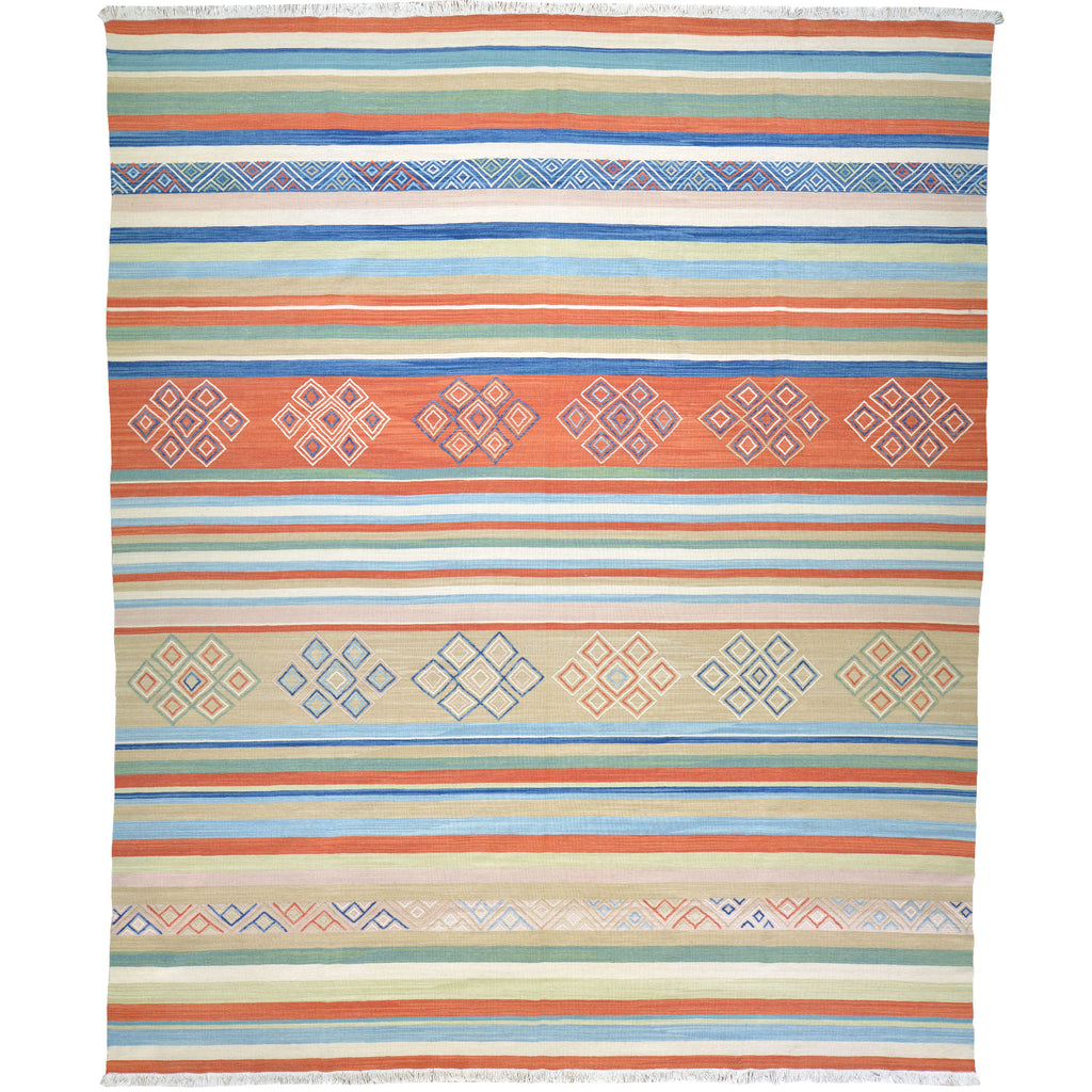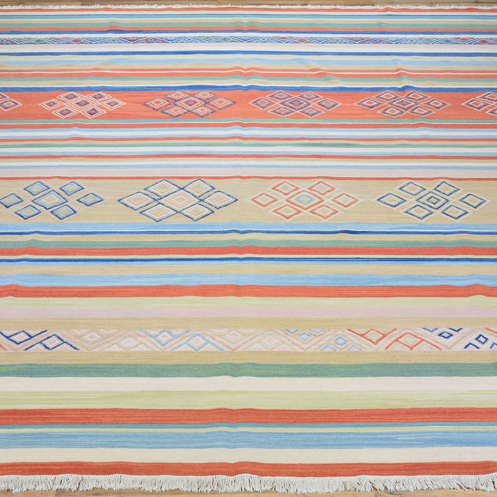 A Hand-Woven rug can also be called a Kilim, or Flatweave and it uses what is called a "Slit-weave" technique. The Slit-weave technique uses only a warp yarn as the foundation, allowing the weaver to build the rug by interlacing the yarn, as the weft.