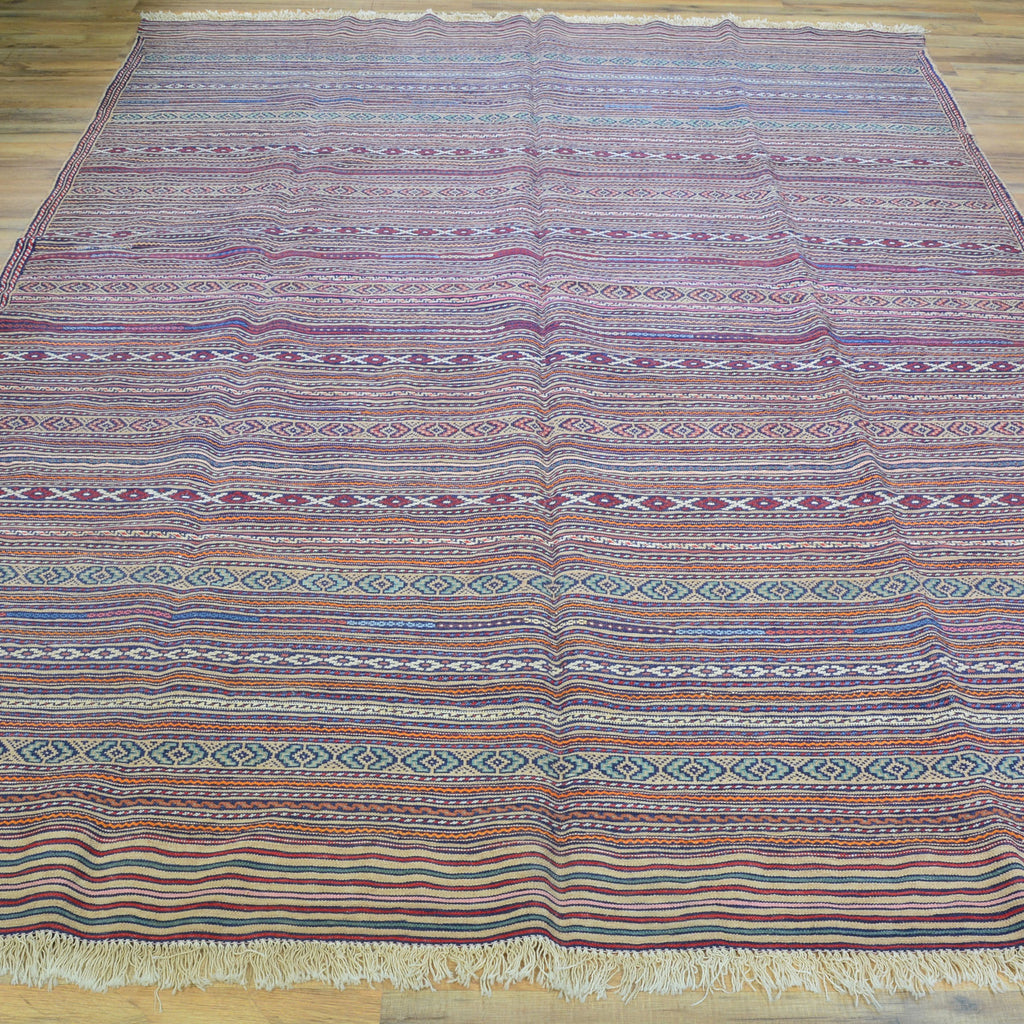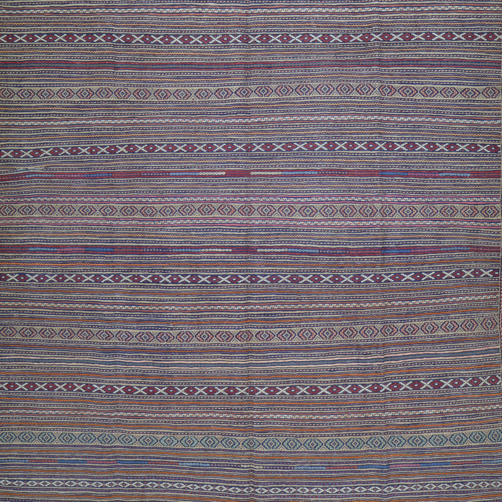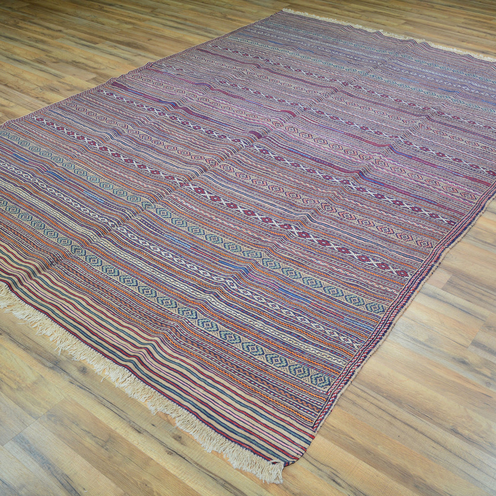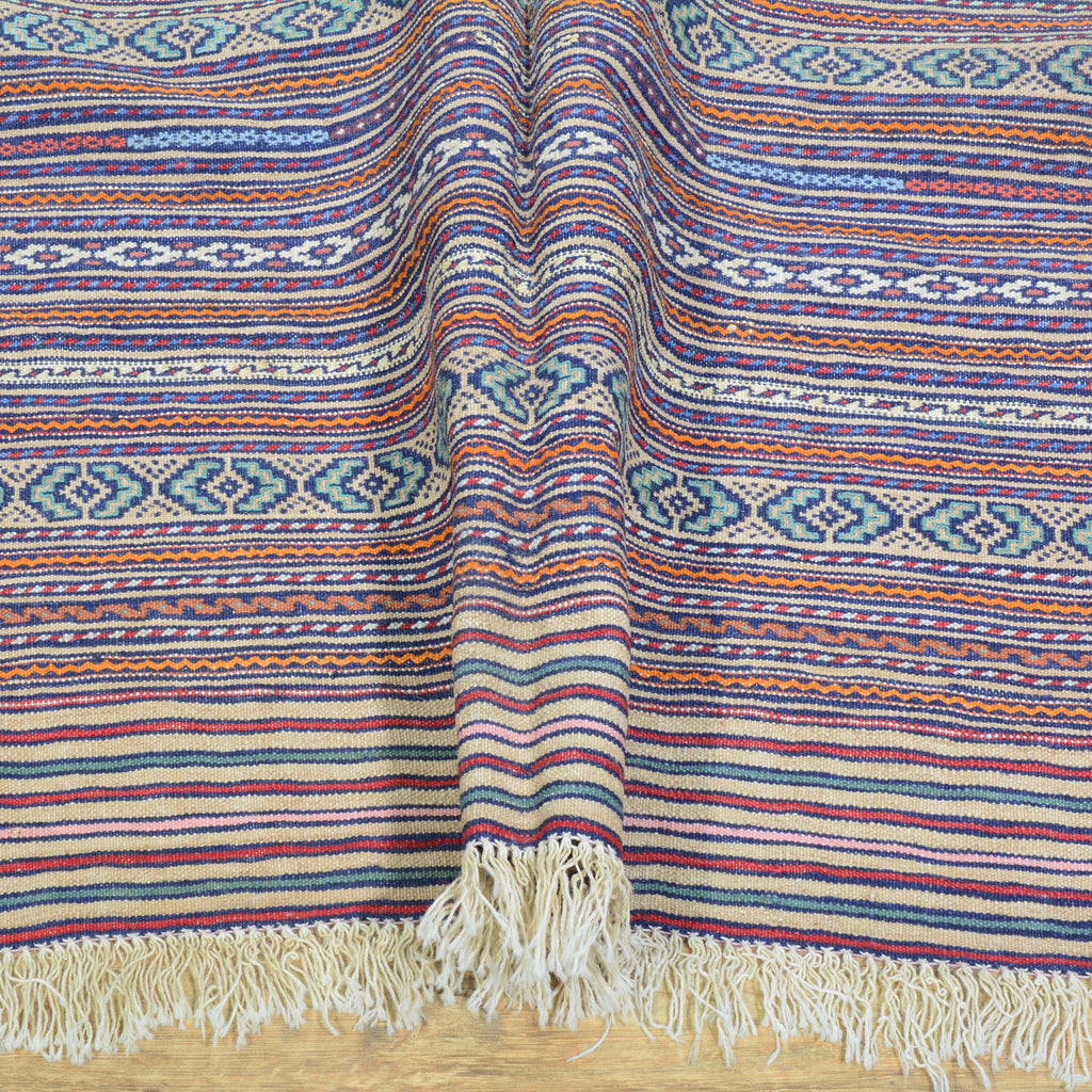 The Soumak Technique is an interesting method of weaving and can result in very beautiful and durable rugs. This method is not as methodical as hand knotted rugs, but it is somewhat more complex than a simple weave. In a traditional weave, the thread is passed alternately in front of and behind the warp. The Soumak weave adds a loop around alternating weaves resulting in an even stronger "stitch." An added layer of complexity includes the loop on the alternate warp in the following row. The end result gives the rug a braided appearance that gives the artist opportunity to incorporate complex geometries into the overall design. This is one of the flat weave techniques that produces a two-sided rug suitable for wall hanging and as a floor rug.