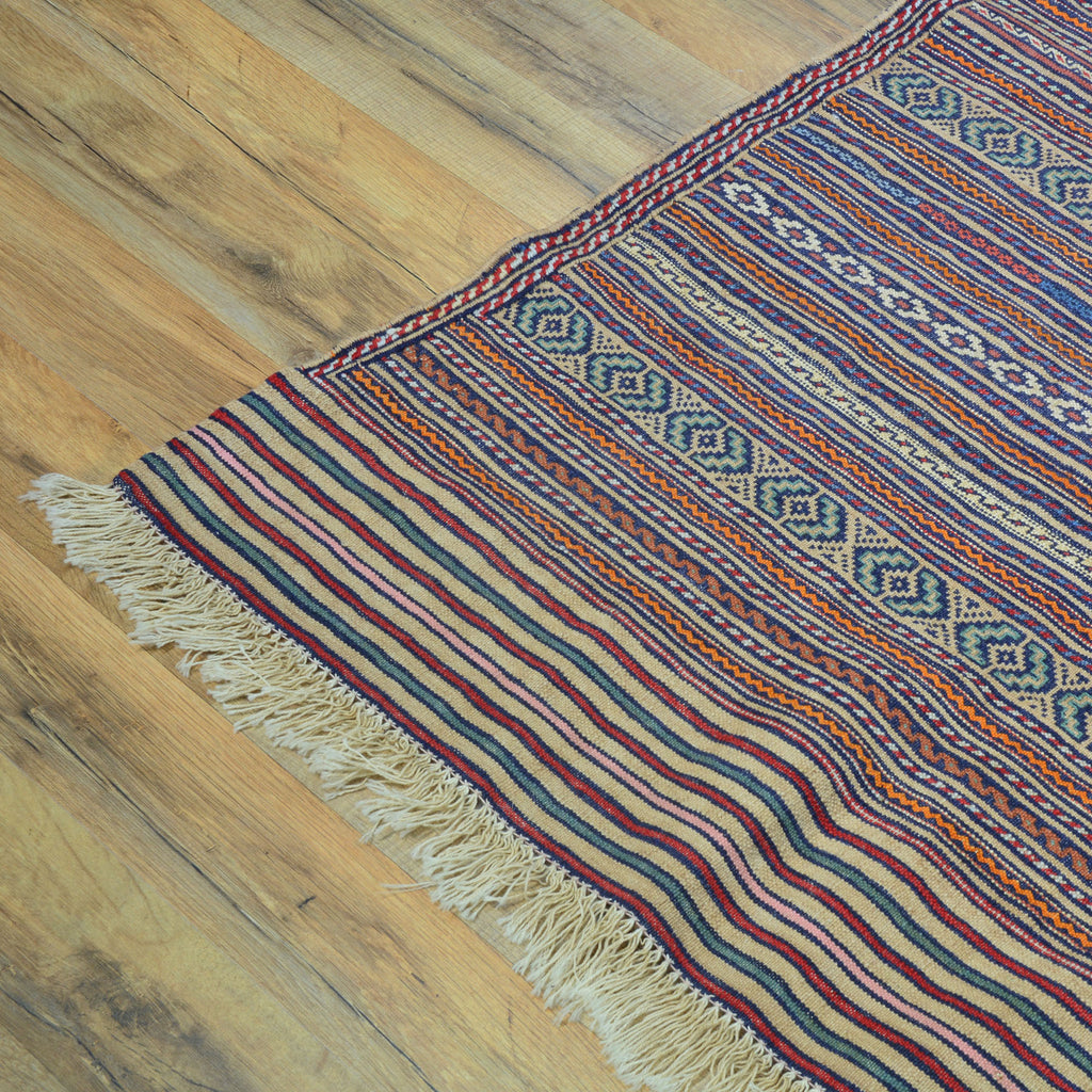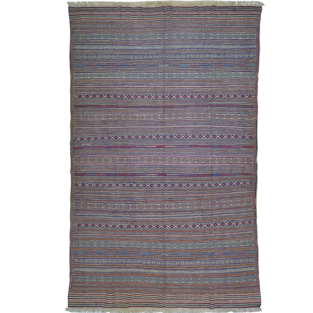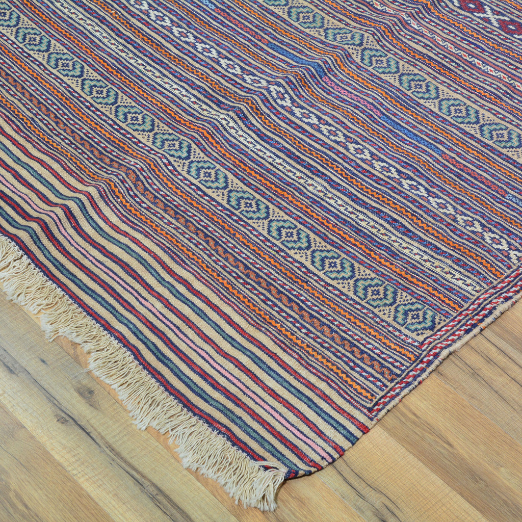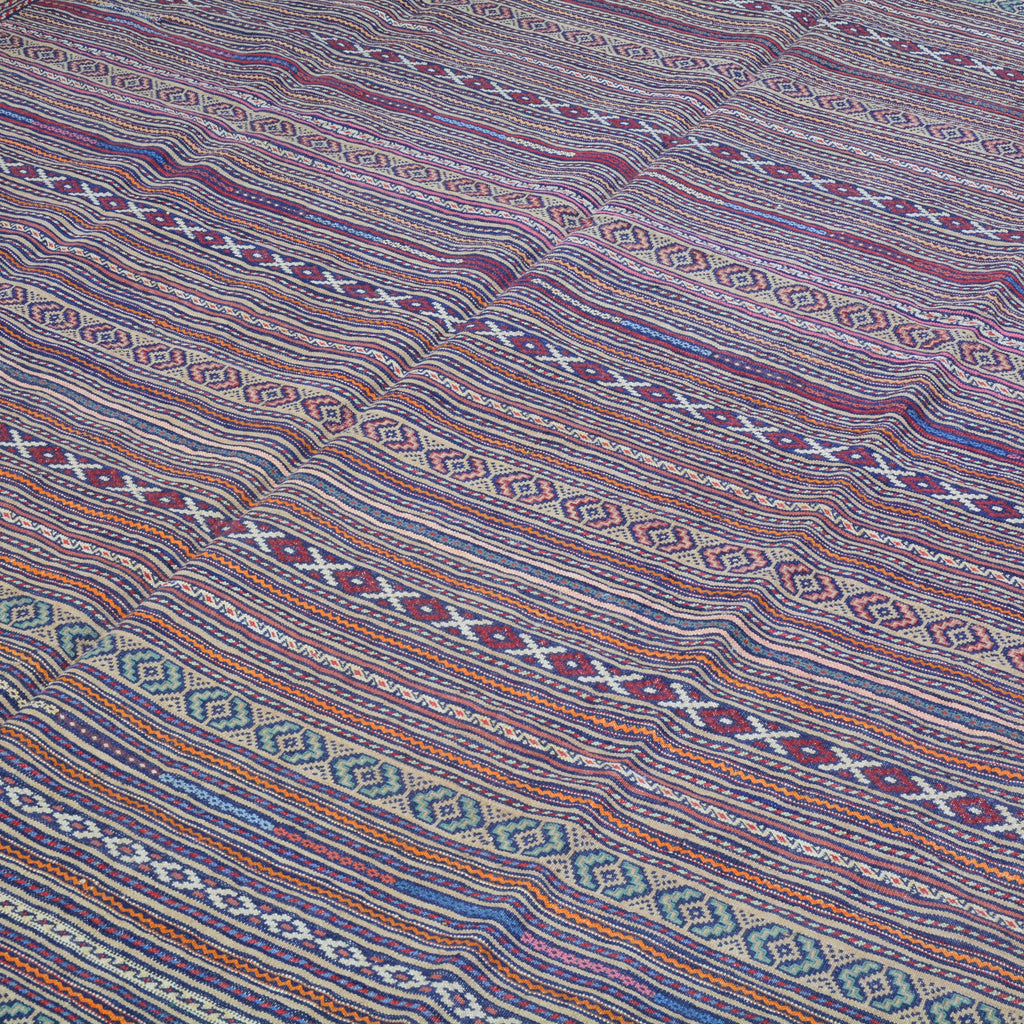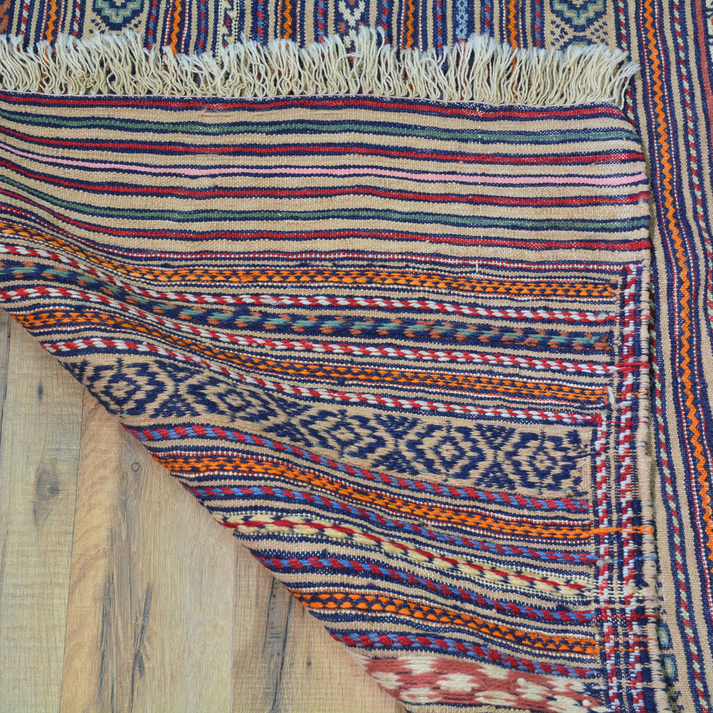 The Soumak Technique is an interesting method of weaving and can result in very beautiful and durable rugs. This method is not as methodical as hand knotted rugs, but it is somewhat more complex than a simple weave. In a traditional weave, the thread is passed alternately in front of and behind the warp. The Soumak weave adds a loop around alternating weaves resulting in an even stronger "stitch." An added layer of complexity includes the loop on the alternate warp in the following row. The end result gives the rug a braided appearance that gives the artist opportunity to incorporate complex geometries into the overall design. This is one of the flat weave techniques that produces a two-sided rug suitable for wall hanging and as a floor rug.
