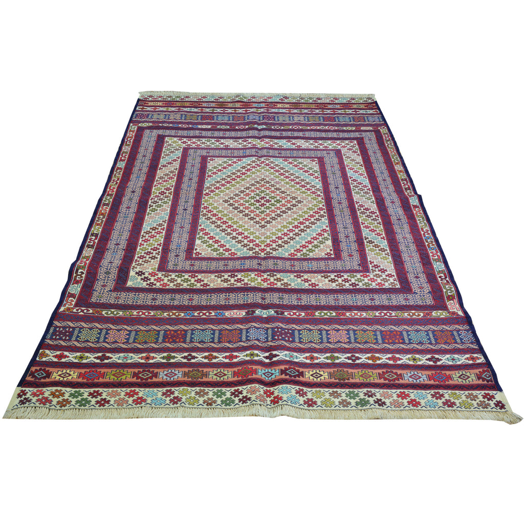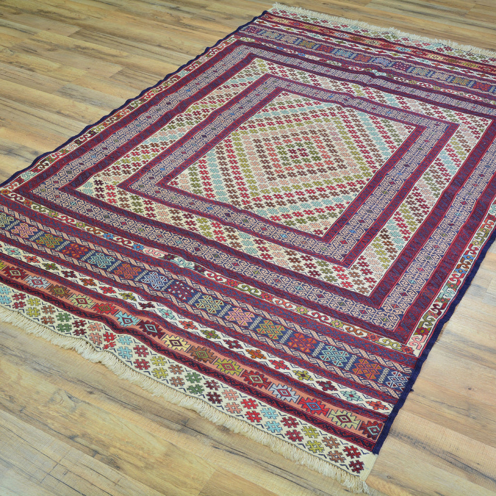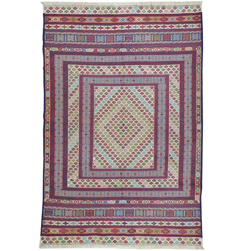 The Soumak Technique is an interesting method of weaving and can result in very beautiful and durable rugs. This method is not as methodical as hand knotted rugs, but it is somewhat more complex than a simple weave. In a traditional weave, the thread is passed alternately in front of and behind the warp. The Soumak weave adds a loop around alternating weaves resulting in an even stronger "stitch." An added layer of complexity includes the loop on the alternate warp in the following row. The end result gives the rug a braided appearance that gives the artist opportunity to incorporate complex geometries into the overall design. This is one of the flat weave techniques that produces a two-sided rug suitable for wall hanging and as a floor rug.