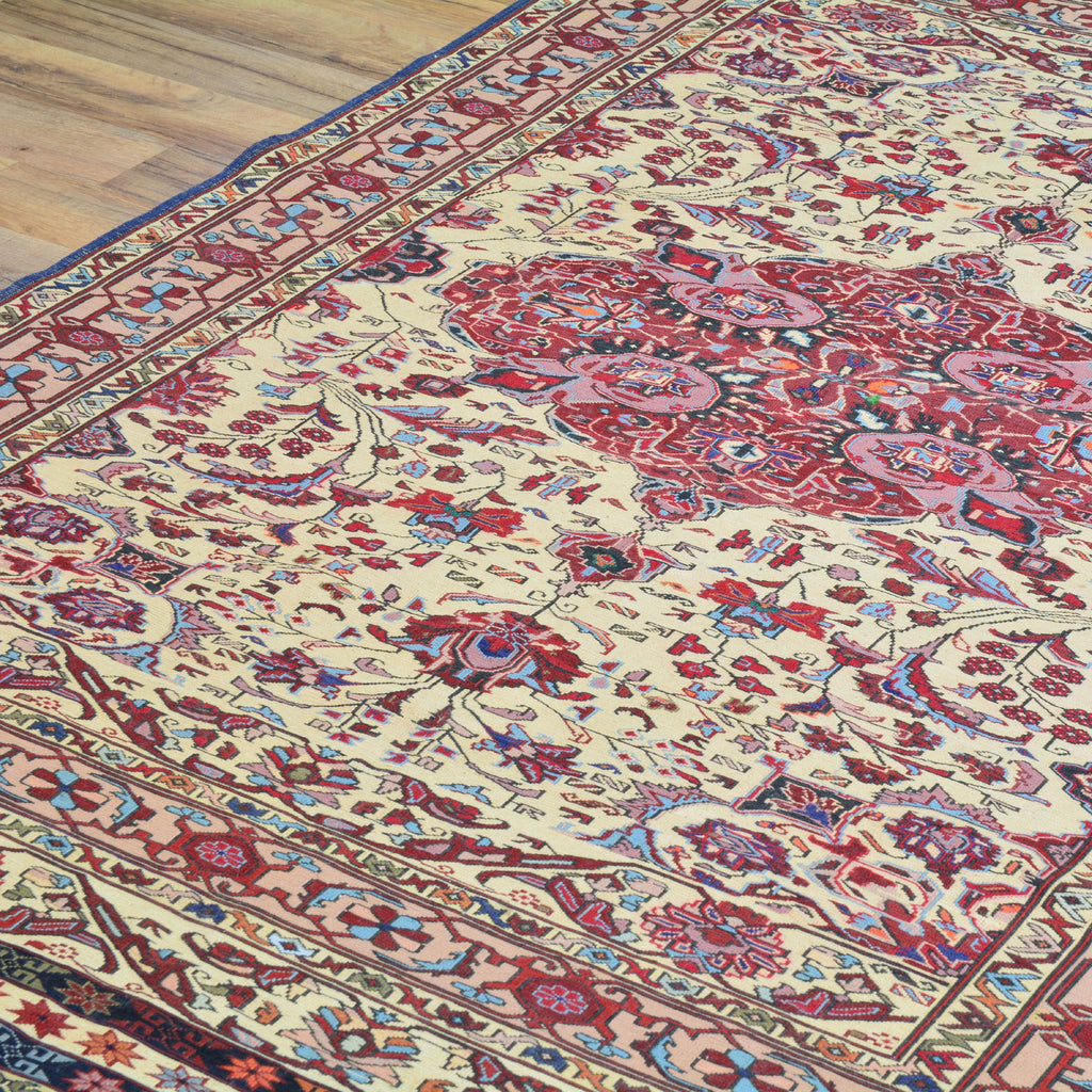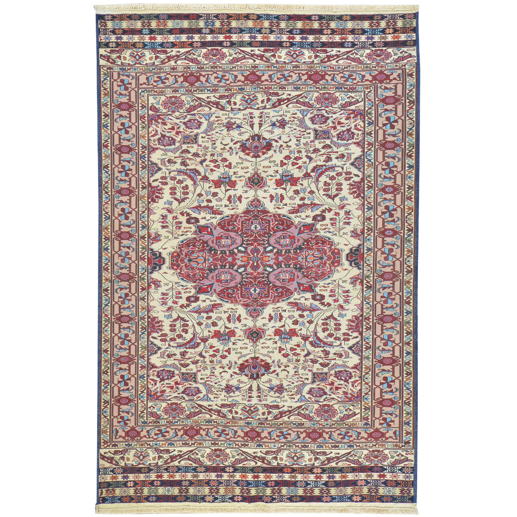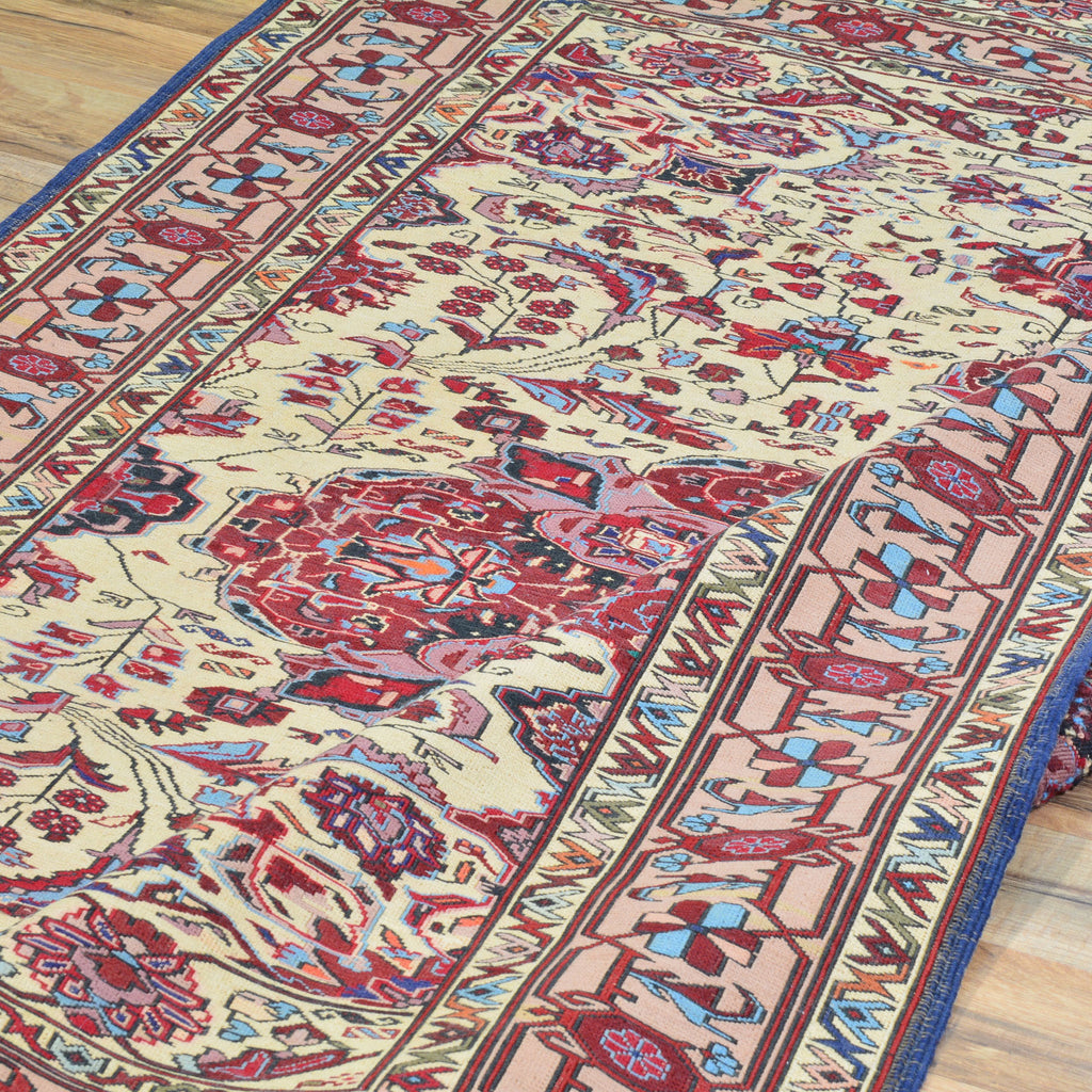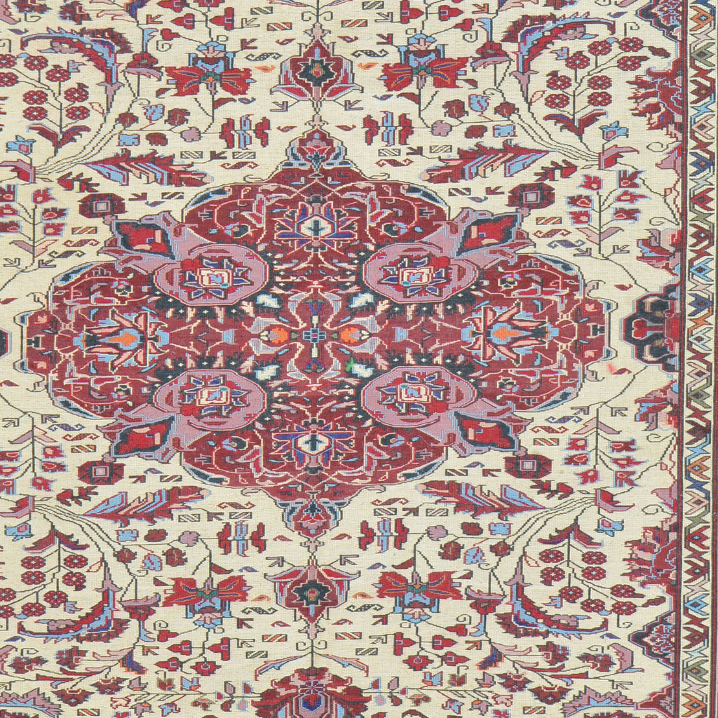 The Soumak Technique is an interesting method of weaving and can result in very beautiful and durable rugs. This method is not as methodical as hand knotted rugs, but it is somewhat more complex than a simple weave. In a traditional weave, the thread is passed alternately in front of and behind the warp. The Soumak weave adds a loop around alternating weaves resulting in an even stronger "stitch." An added layer of complexity includes the loop on the alternate warp in the following row. The end result gives the rug a braided appearance that gives the artist opportunity to incorporate complex geometries into the overall design. This is one of the flat weave techniques that produces a two-sided rug suitable for wall hanging and as a floor rug.