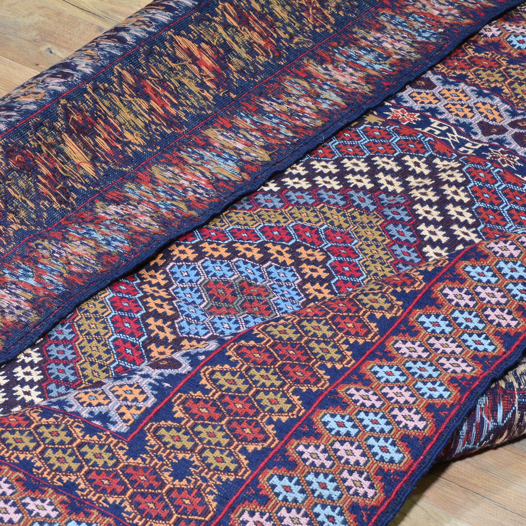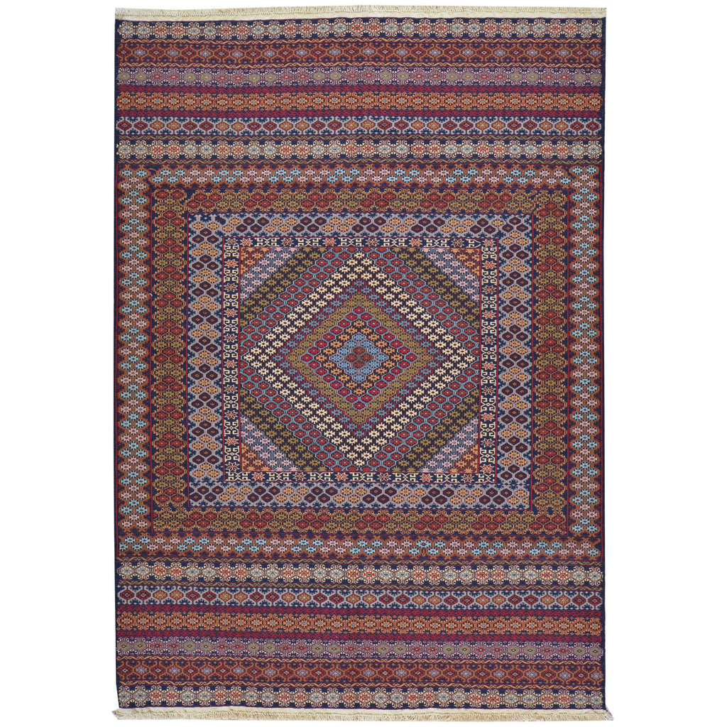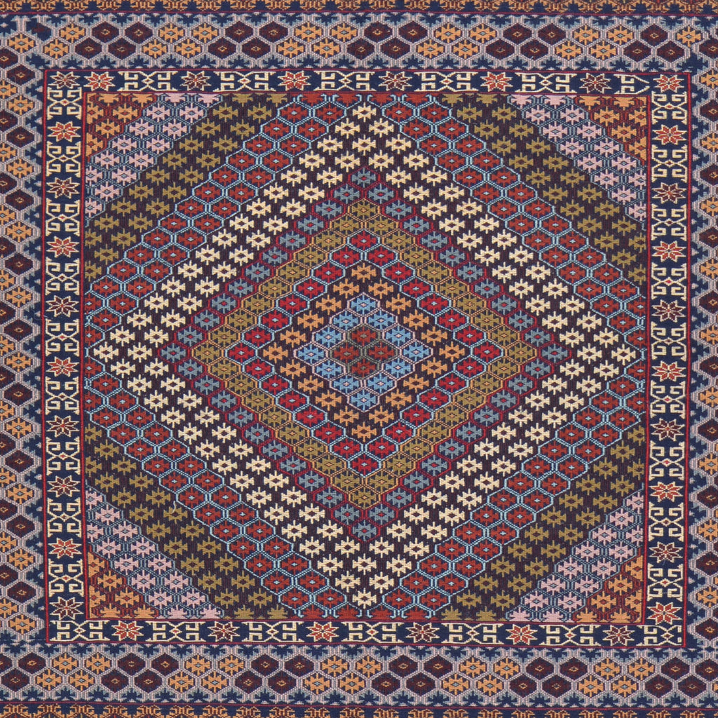 The Soumak Technique is an interesting method of weaving and can result in very beautiful and durable rugs. This method is not as methodical as hand knotted rugs, but it is somewhat more complex than a simple weave. In a traditional weave, the thread is passed alternately in front of and behind the warp. The Soumak weave adds a loop around alternating weaves resulting in an even stronger "stitch." An added layer of complexity includes the loop on the alternate warp in the following row. The end result gives the rug a braided appearance that gives the artist opportunity to incorporate complex geometries into the overall design. This is one of the flat weave techniques that produces a two-sided rug suitable for wall hanging and as a floor rug.