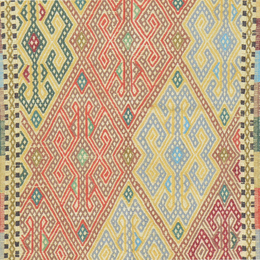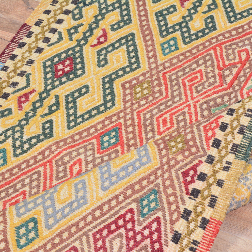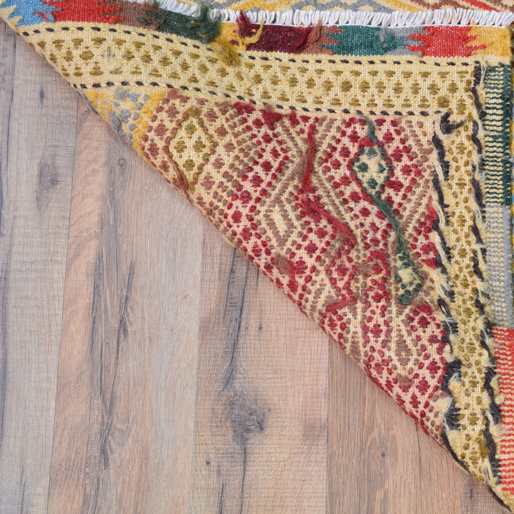 The Soumak Technique is an interesting method of weaving and can result in very beautiful and durable rugs. This method is not as methodical as hand knotted rugs, but it is somewhat more complex than a simple weave. In a traditional weave, the thread is passed alternately in front of and behind the warp. The Soumak weave adds a loop around alternating weaves resulting in an even stronger "stitch." An added layer of complexity includes the loop on the alternate warp in the following row. The end result gives the rug a braided appearance that gives the artist opportunity to incorporate complex geometries into the overall design. This is one of the flat weave techniques that produces a two-sided rug suitable for wall hanging and as a floor rug.