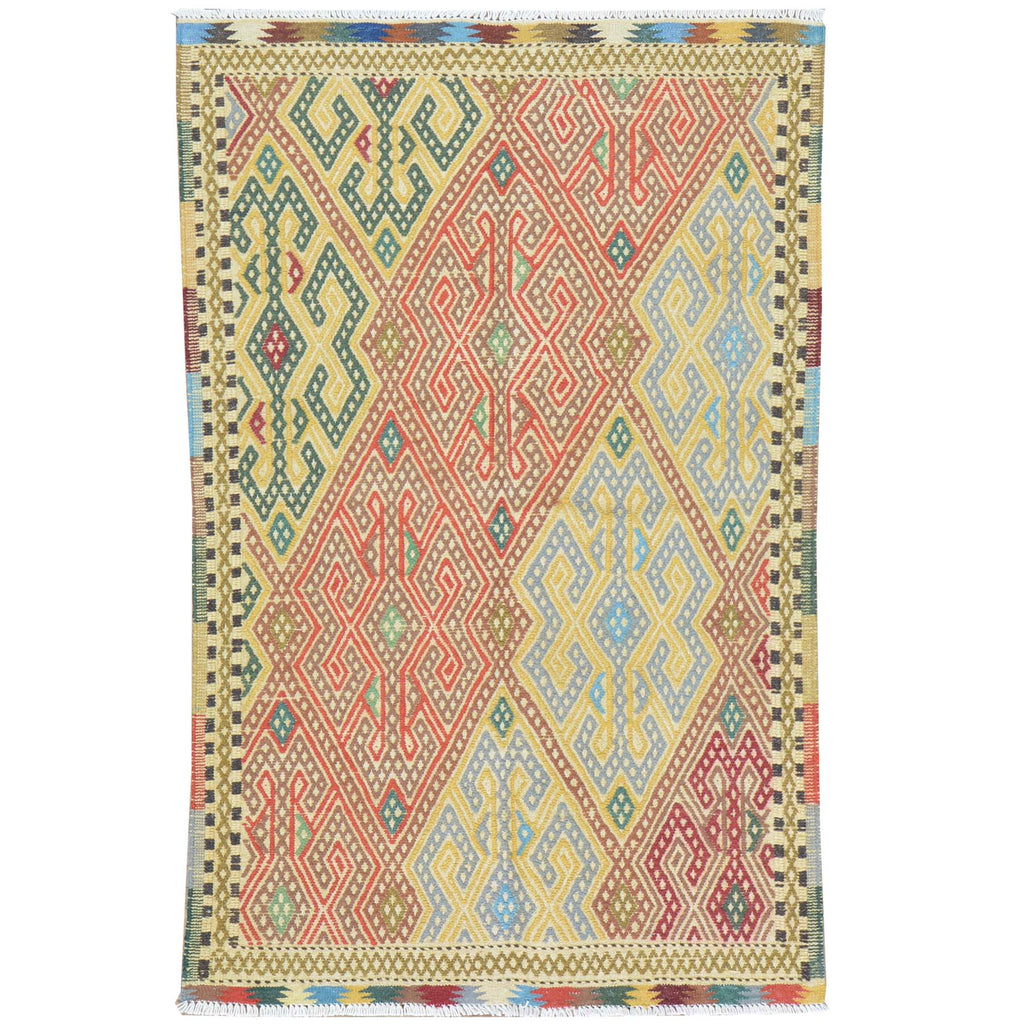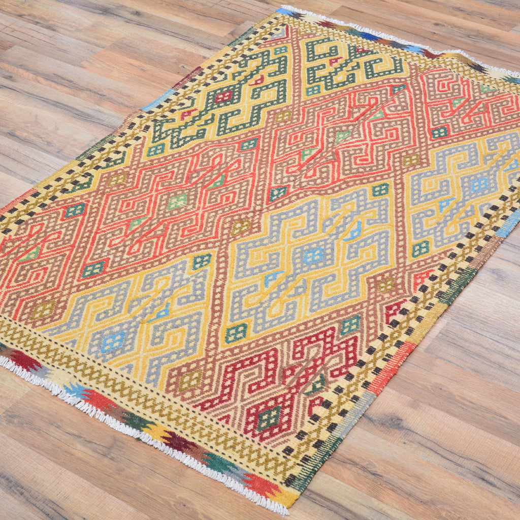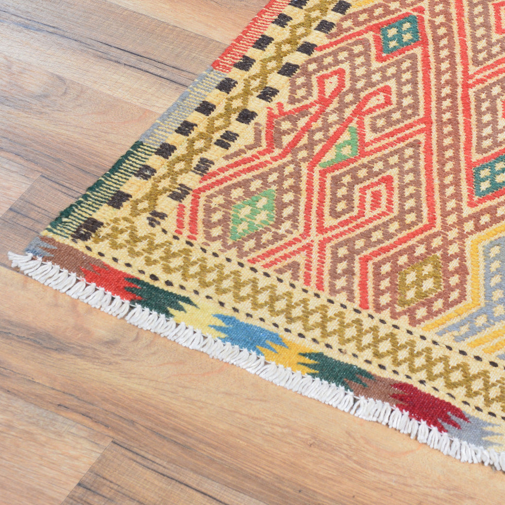 The Soumak Technique is an interesting method of weaving and can result in very beautiful and durable rugs. This method is not as methodical as hand knotted rugs, but it is somewhat more complex than a simple weave. In a traditional weave, the thread is passed alternately in front of and behind the warp. The Soumak weave adds a loop around alternating weaves resulting in an even stronger "stitch." An added layer of complexity includes the loop on the alternate warp in the following row. The end result gives the rug a braided appearance that gives the artist opportunity to incorporate complex geometries into the overall design. This is one of the flat weave techniques that produces a two-sided rug suitable for wall hanging and as a floor rug.