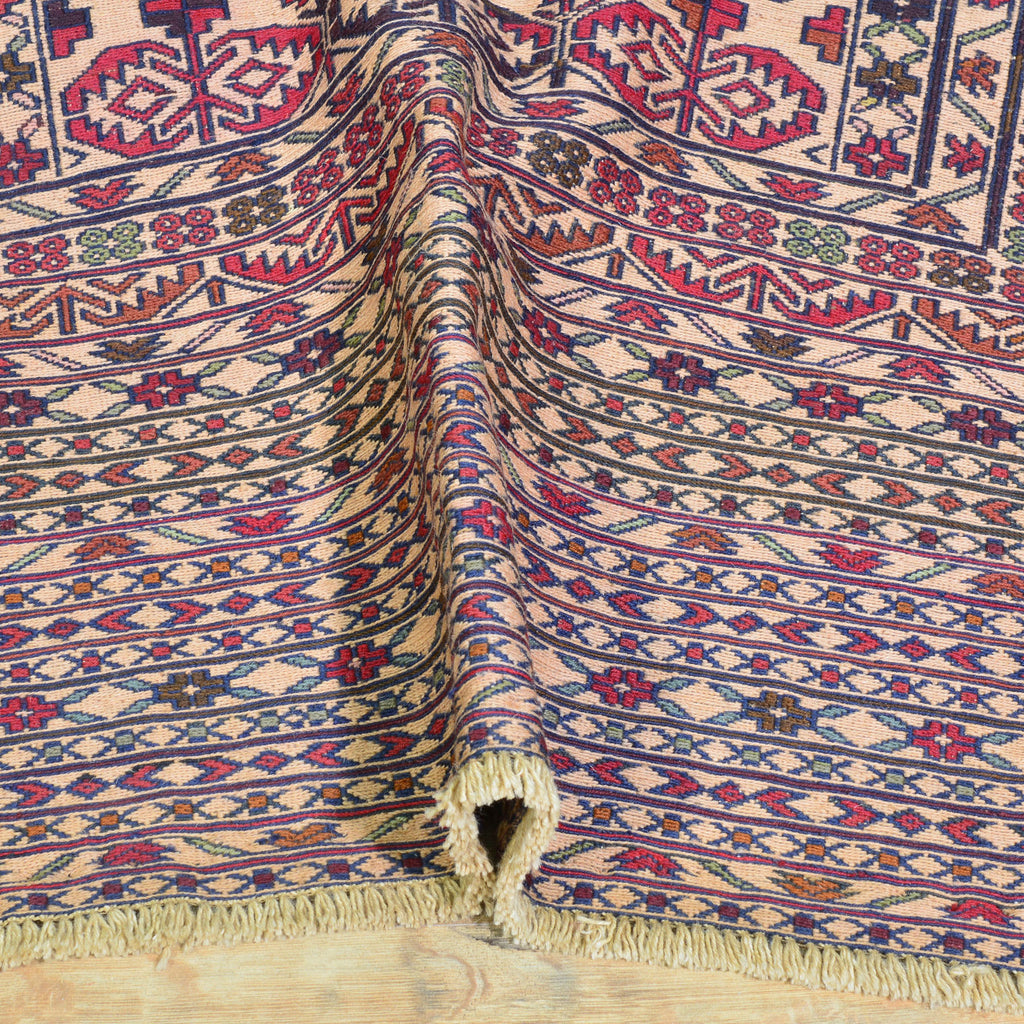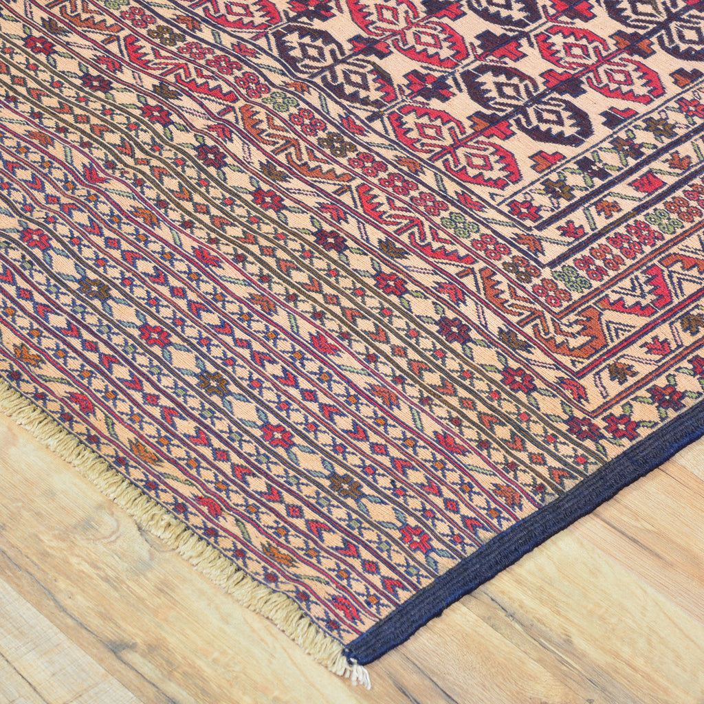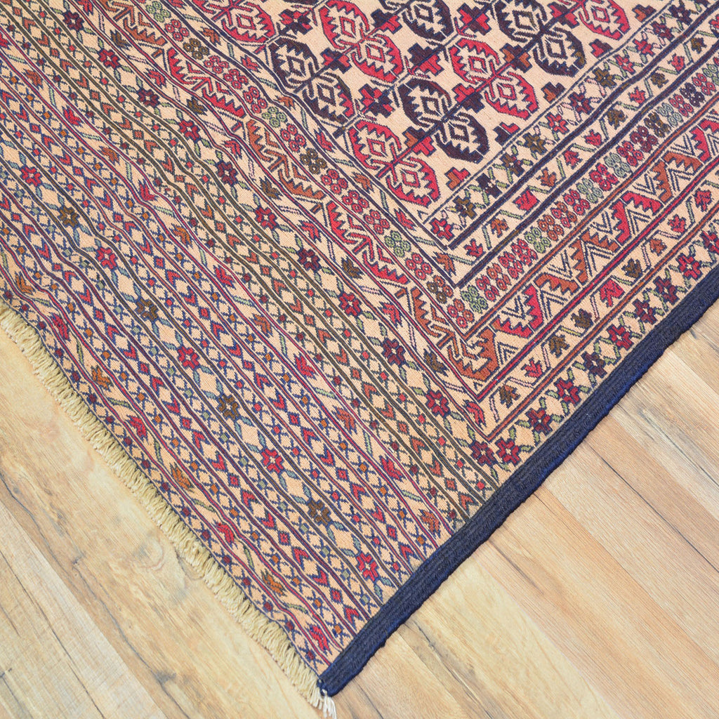The Soumak Technique is an interesting method of weaving and can result in very beautiful and durable rugs. This method is not as methodical as hand knotted rugs, but it is somewhat more complex than a simple weave. In a traditional weave, the thread is passed alternately in front of and behind the warp. The Soumak weave adds a loop around alternating weaves resulting in an even stronger "stitch." An added layer of complexity includes the loop on the alternate warp in the following row. The end result gives the rug a braided appearance that gives the artist opportunity to incorporate complex geometries into the overall design. This is one of the flat weave techniques that produces a two-sided rug suitable for wall hanging and as a floor rug.