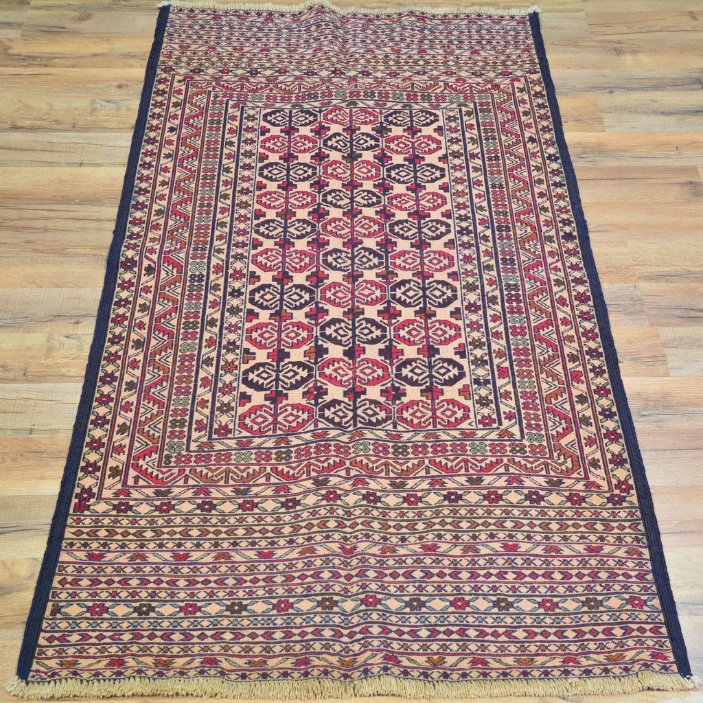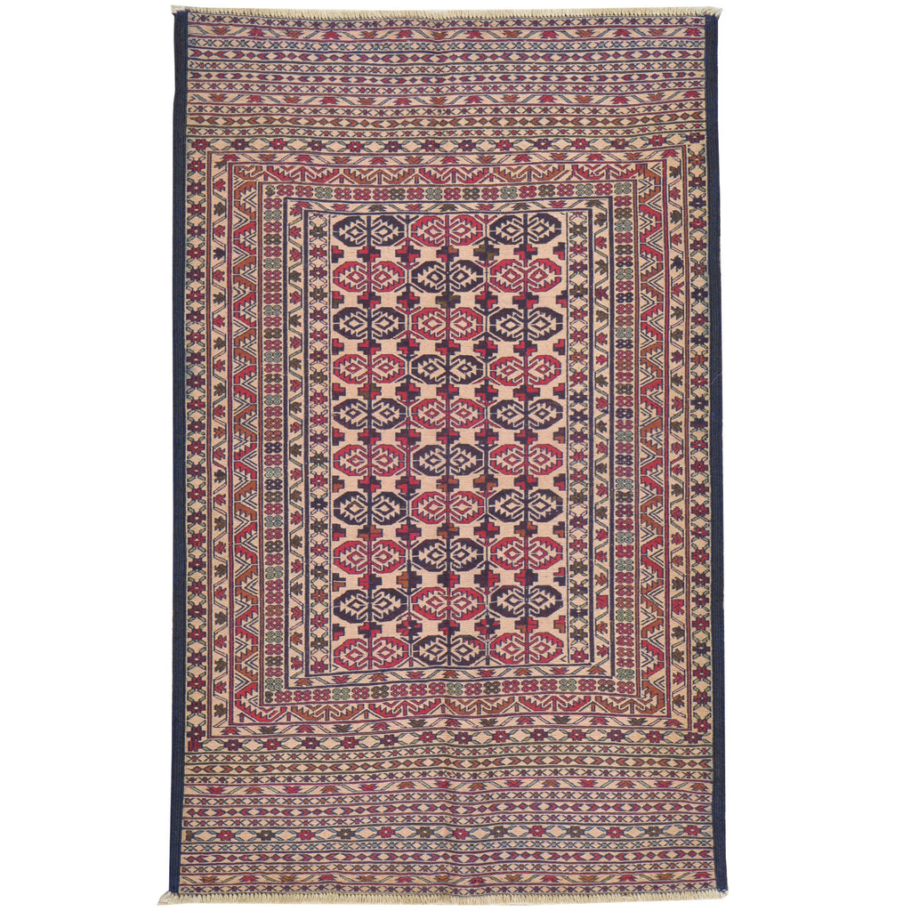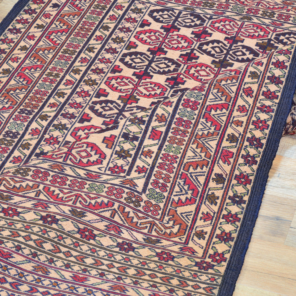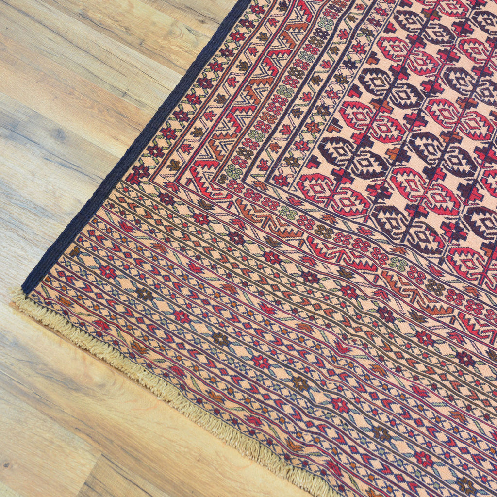 The Soumak Technique is an interesting method of weaving and can result in very beautiful and durable rugs. This method is not as methodical as hand knotted rugs, but it is somewhat more complex than a simple weave. In a traditional weave, the thread is passed alternately in front of and behind the warp. The Soumak weave adds a loop around alternating weaves resulting in an even stronger "stitch." An added layer of complexity includes the loop on the alternate warp in the following row. The end result gives the rug a braided appearance that gives the artist opportunity to incorporate complex geometries into the overall design. This is one of the flat weave techniques that produces a two-sided rug suitable for wall hanging and as a floor rug.